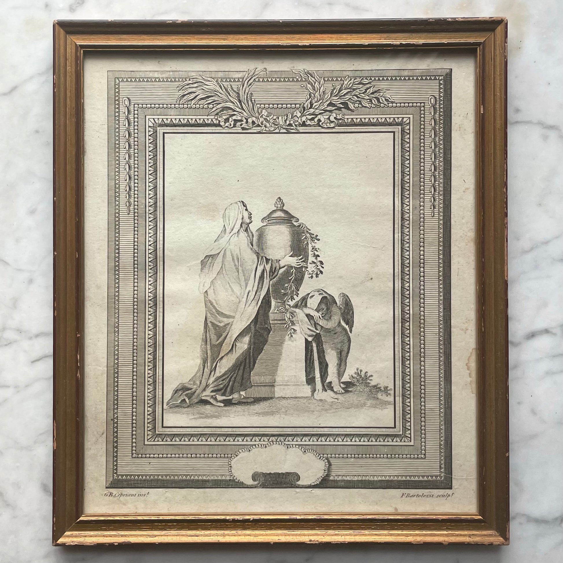 Officially the oldest mourning print I’ve had in the shop to date: This stunning black and white engraving dates to 1790 and depicts a mourner beside a funeral urn and weeping angel. I was able to date it to an early bible: Reverend Dr. Paul Wright's The Christians New And Complete British Family Bible. Copper plate engraving on thick, heavy rag paper. Lovingly conserved in a simple gilded wood frame. Refer to photos for size.