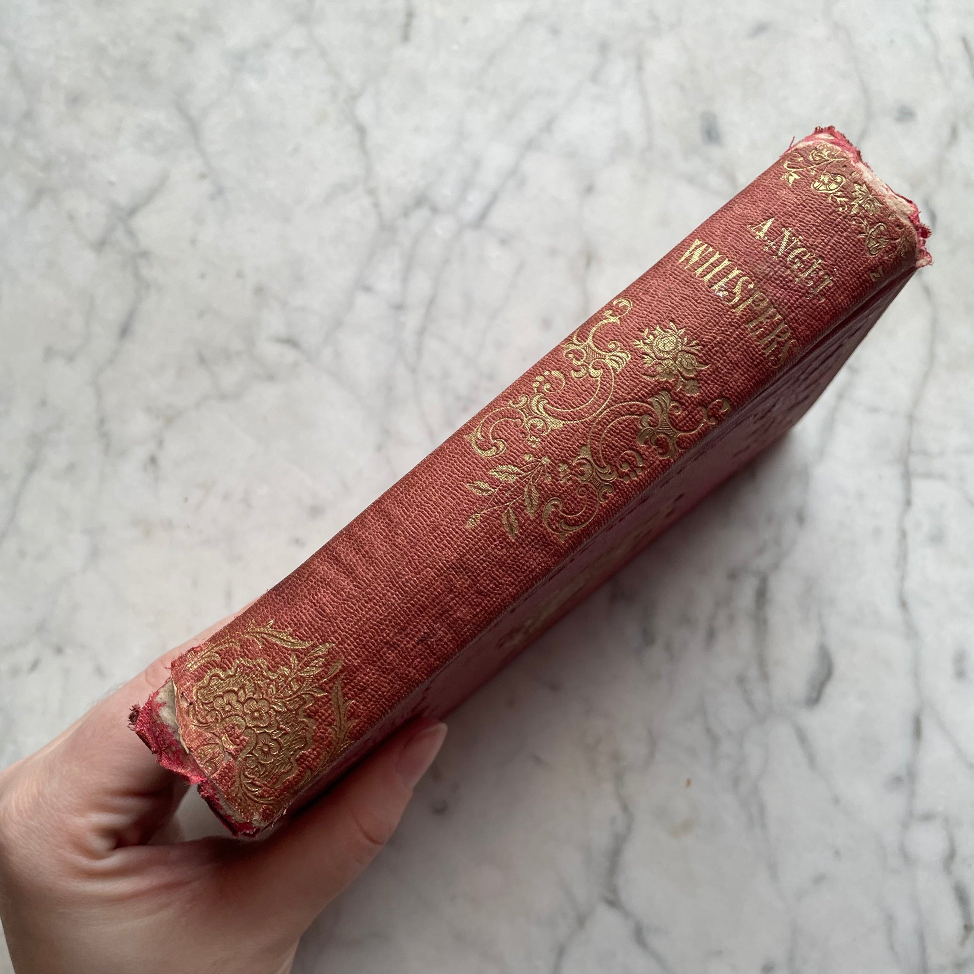 Bright red cloth binding with gilt embellishments on the cover and the spine. Condition is good overall with some insect damage at the spine.