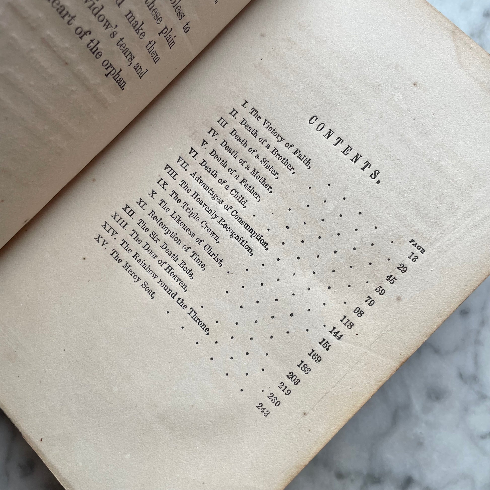This 1857 volume is a beautiful example of Victorian “consolation literature” meant to comfort the bereaved and contains verses and essays about death, grieving, and everlasting life in heaven.