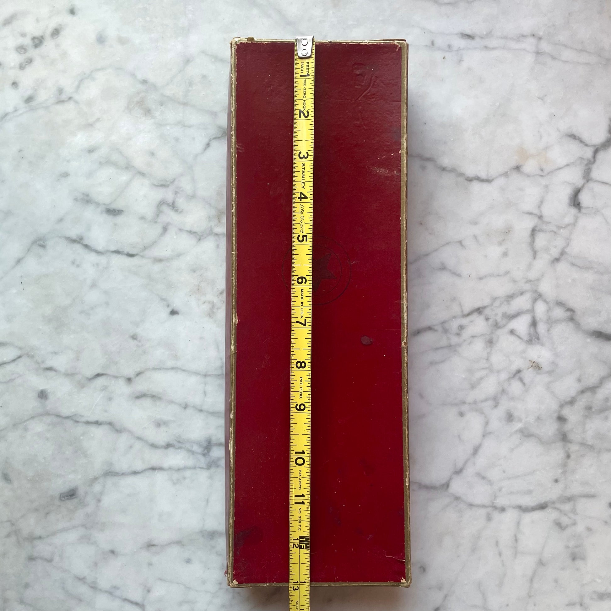 Early 20th century antique artist’s kit in an old hose box containing pencils, paintbrushes, a box of paint tubes, porcelain cabochons, and pieces of card. Roman gold box is empty. Refer to photos for size and condition.