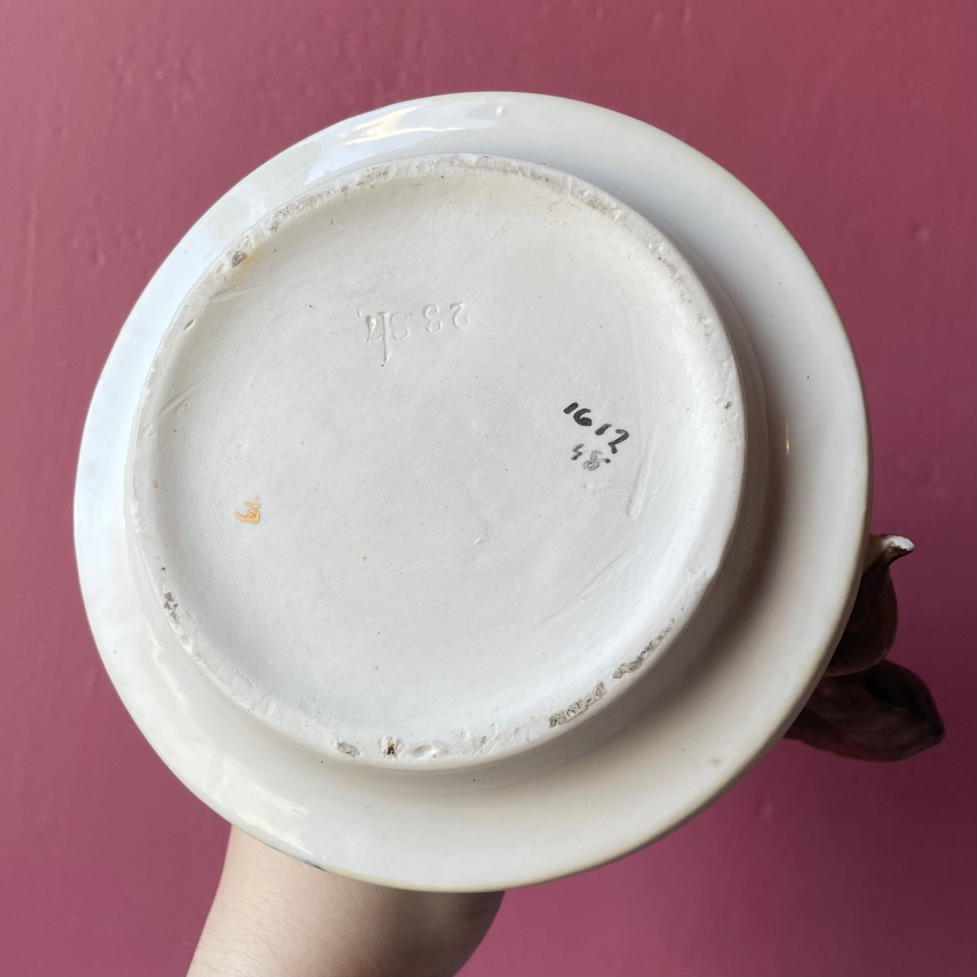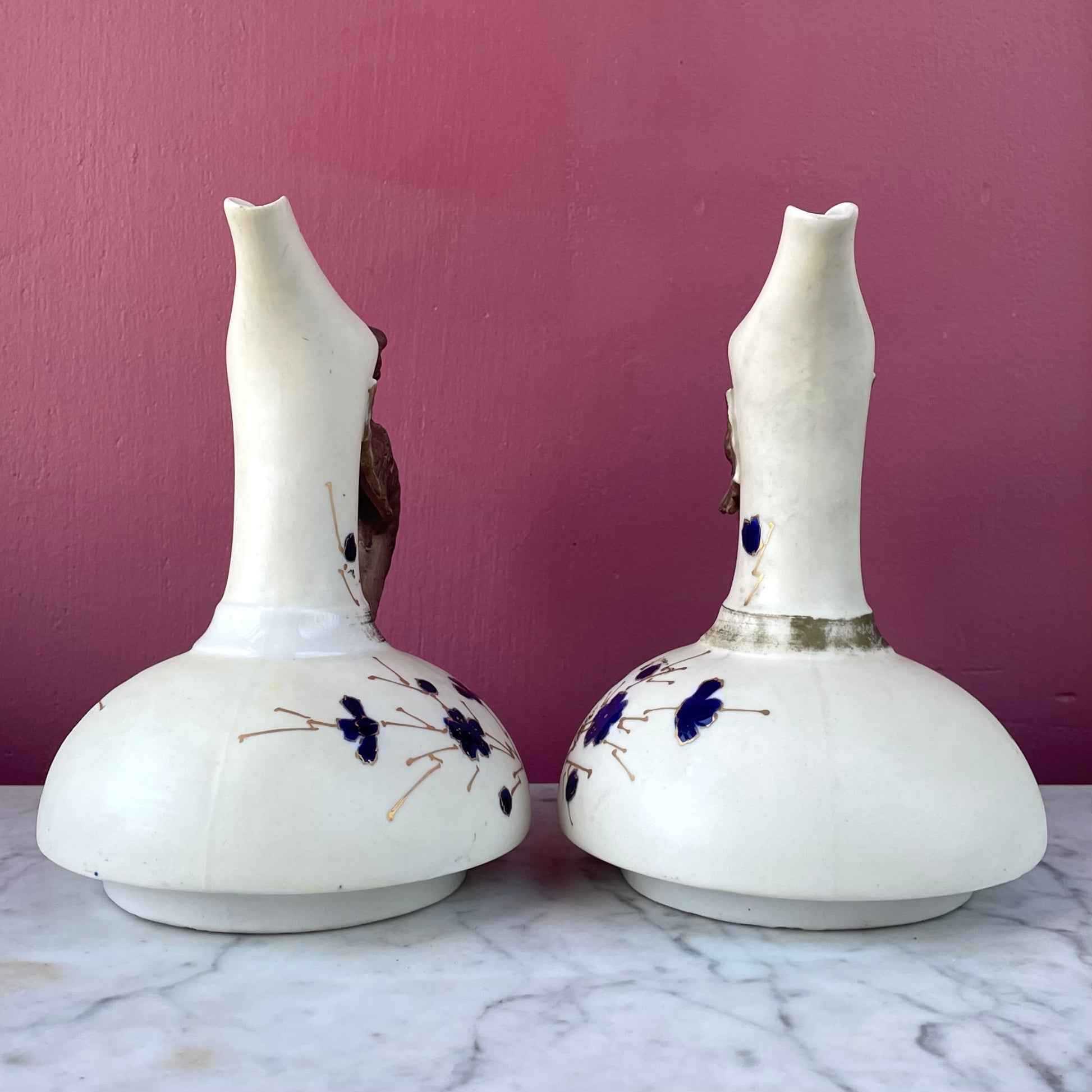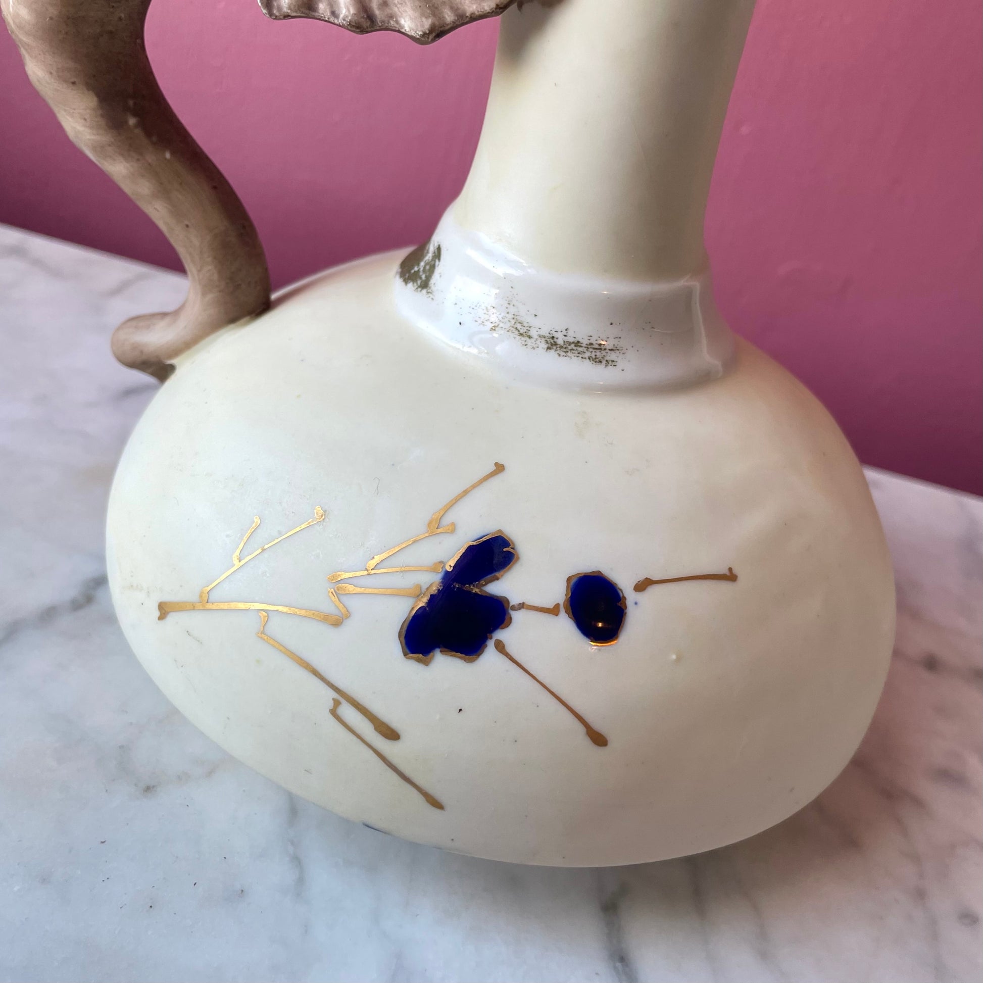 Lovely pair of antique porcelain ewers with dragon shaped handles. Couldn’t identify the marks but they look Austrian or Germany for sure- perhaps a competitor to Amphora or Teplitz. Condition is good overall with some wear to the gilded bands around the middle and the blue glaze of the flowers.