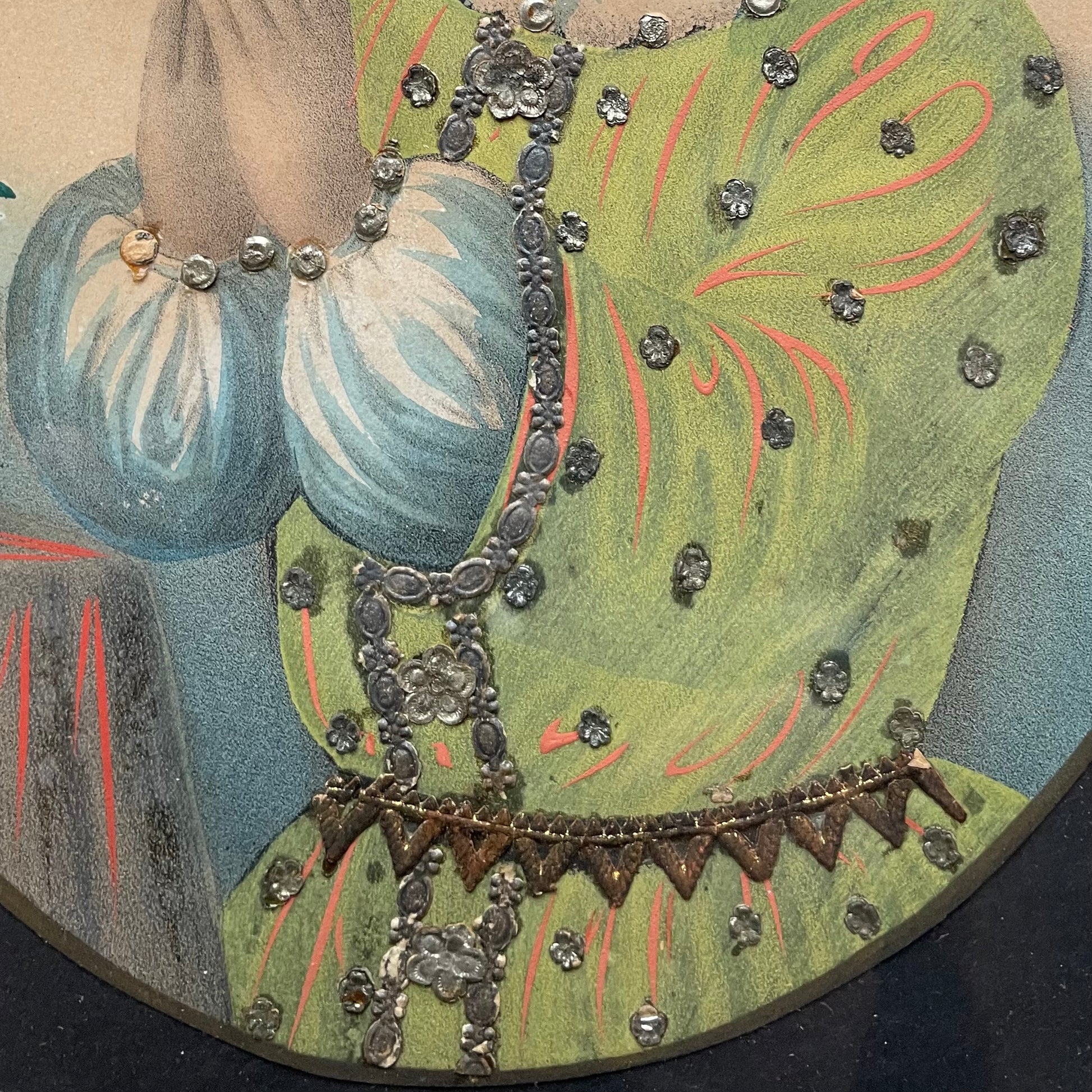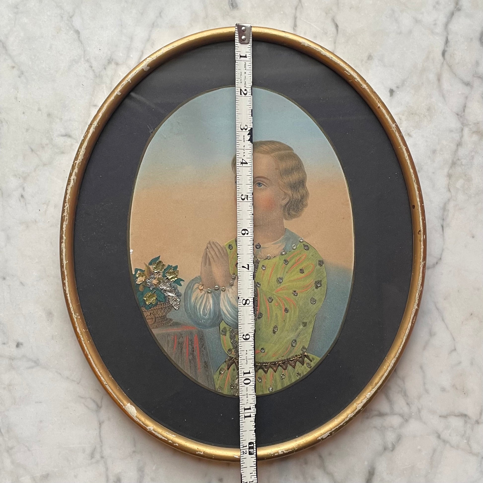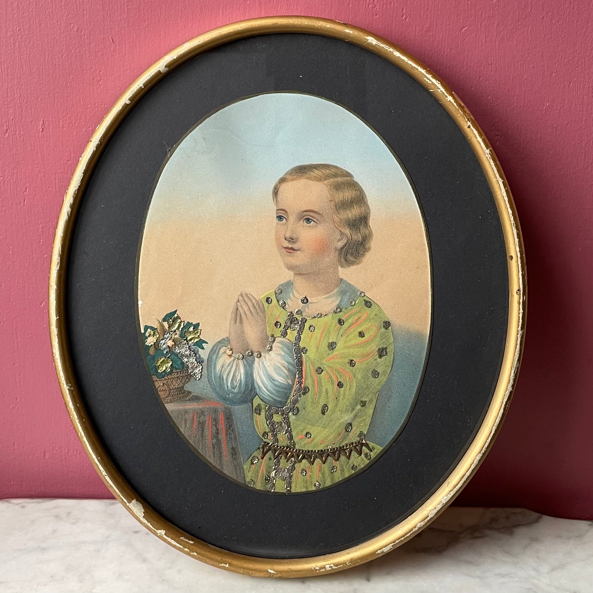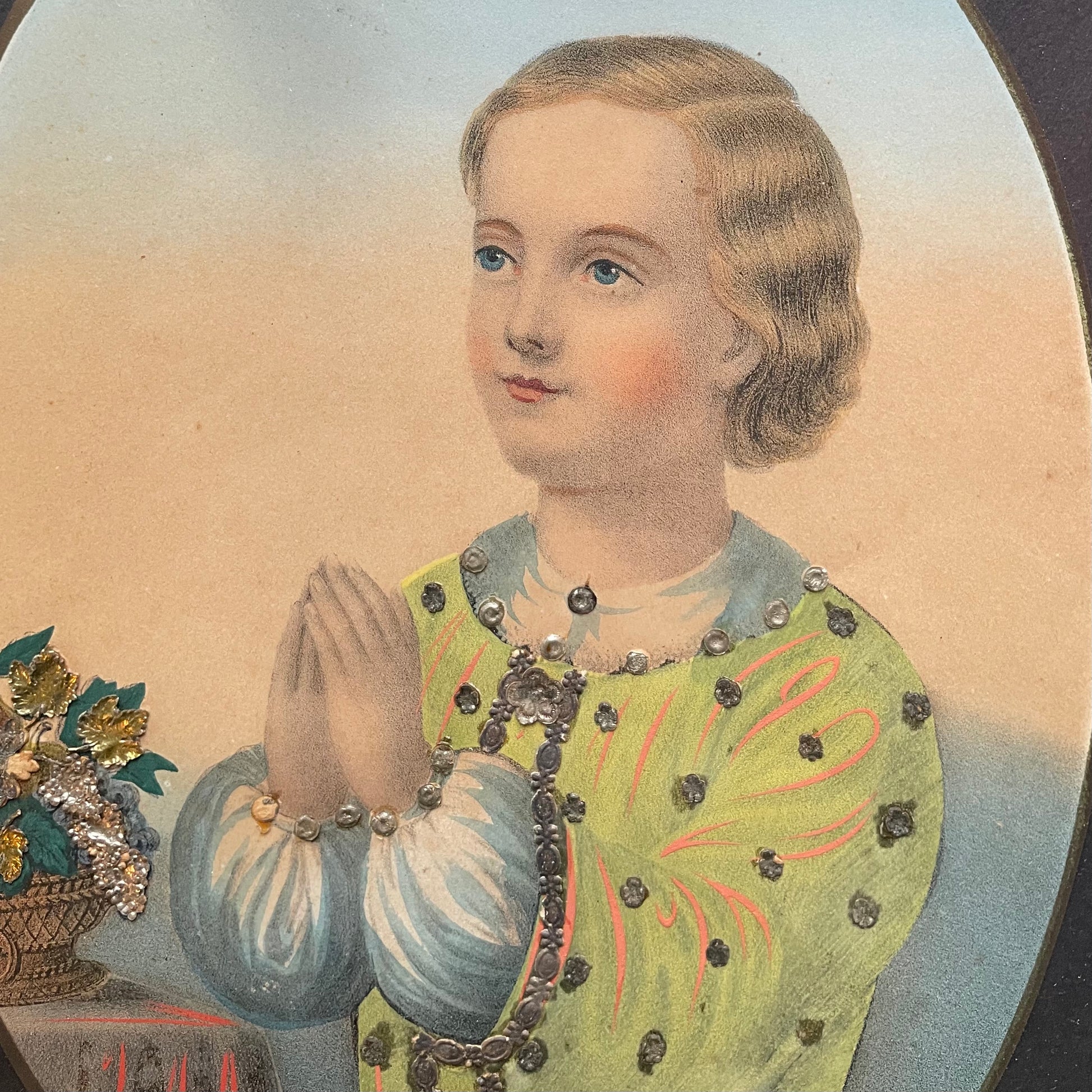 Mid- 19th century German devotional print of a child praying, hand colored with metallic Dresden paper die cut embellishments. Refer to photos for size and condition: Very good with some wear to the frame.