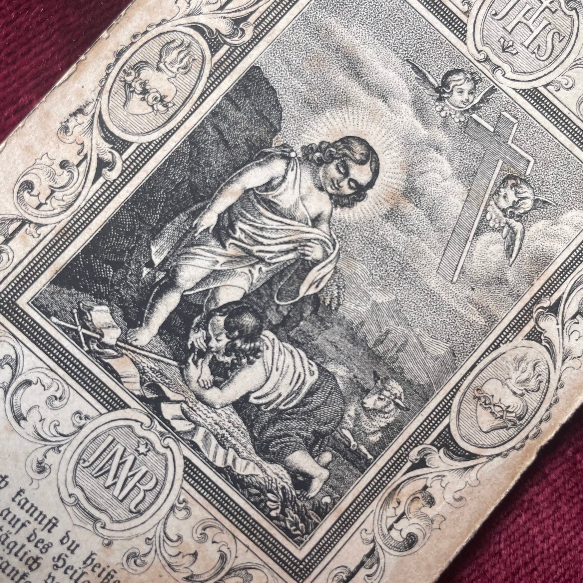Mid-19th century antique German holy card. Refer to photos for size and condition.
