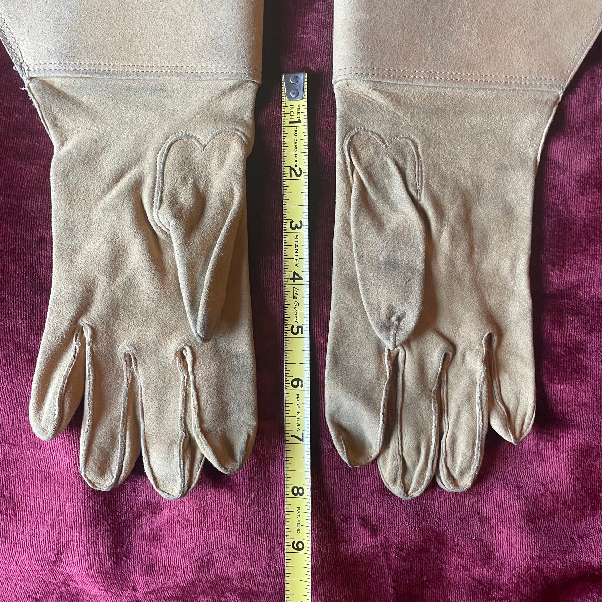 Turn of the century antique Knights Templar gauntlets made of beige kid leather with red appliqué crosses sewn onto the stiff cuffs. Marked size 8: Refer to photos for size and condition. Some soiling from age.