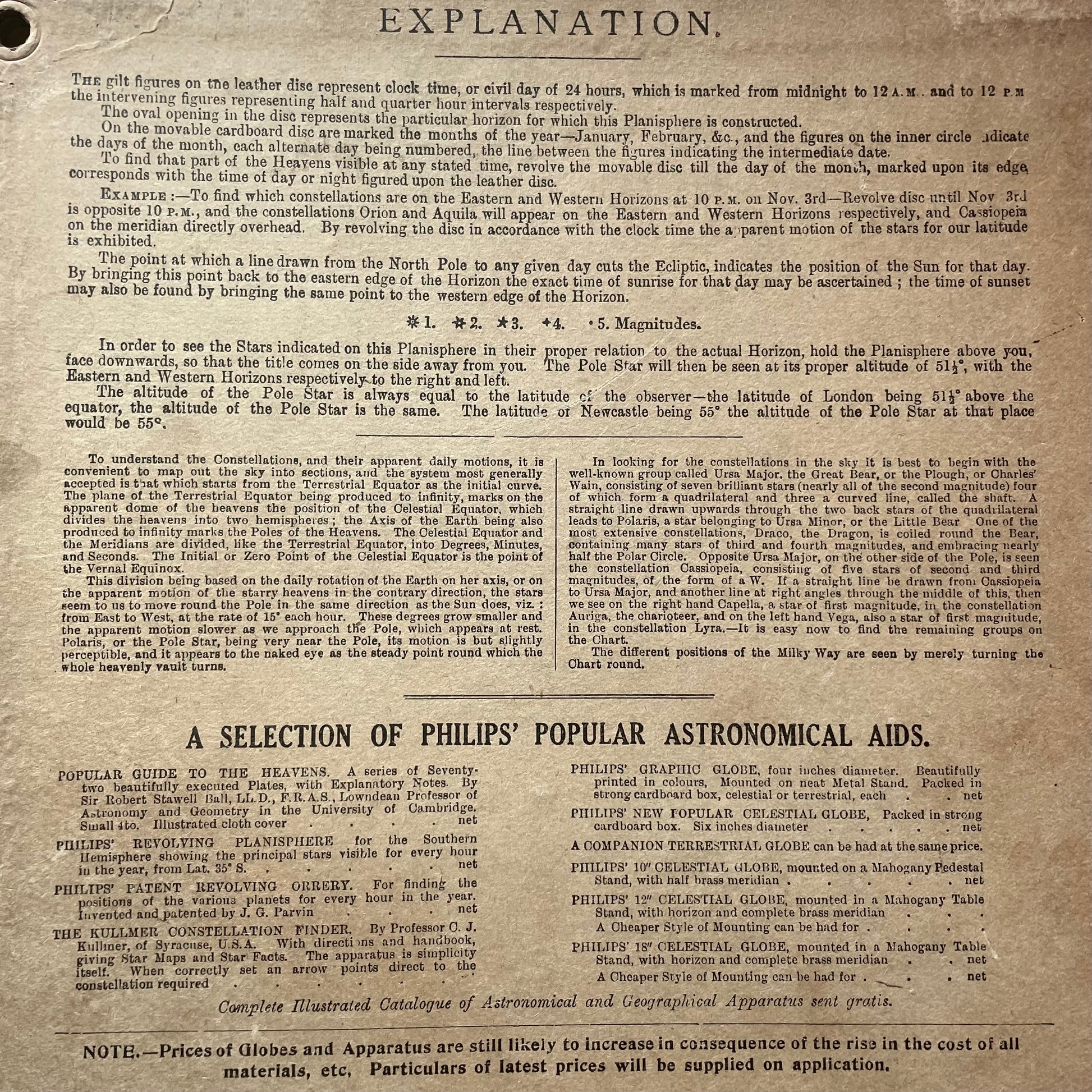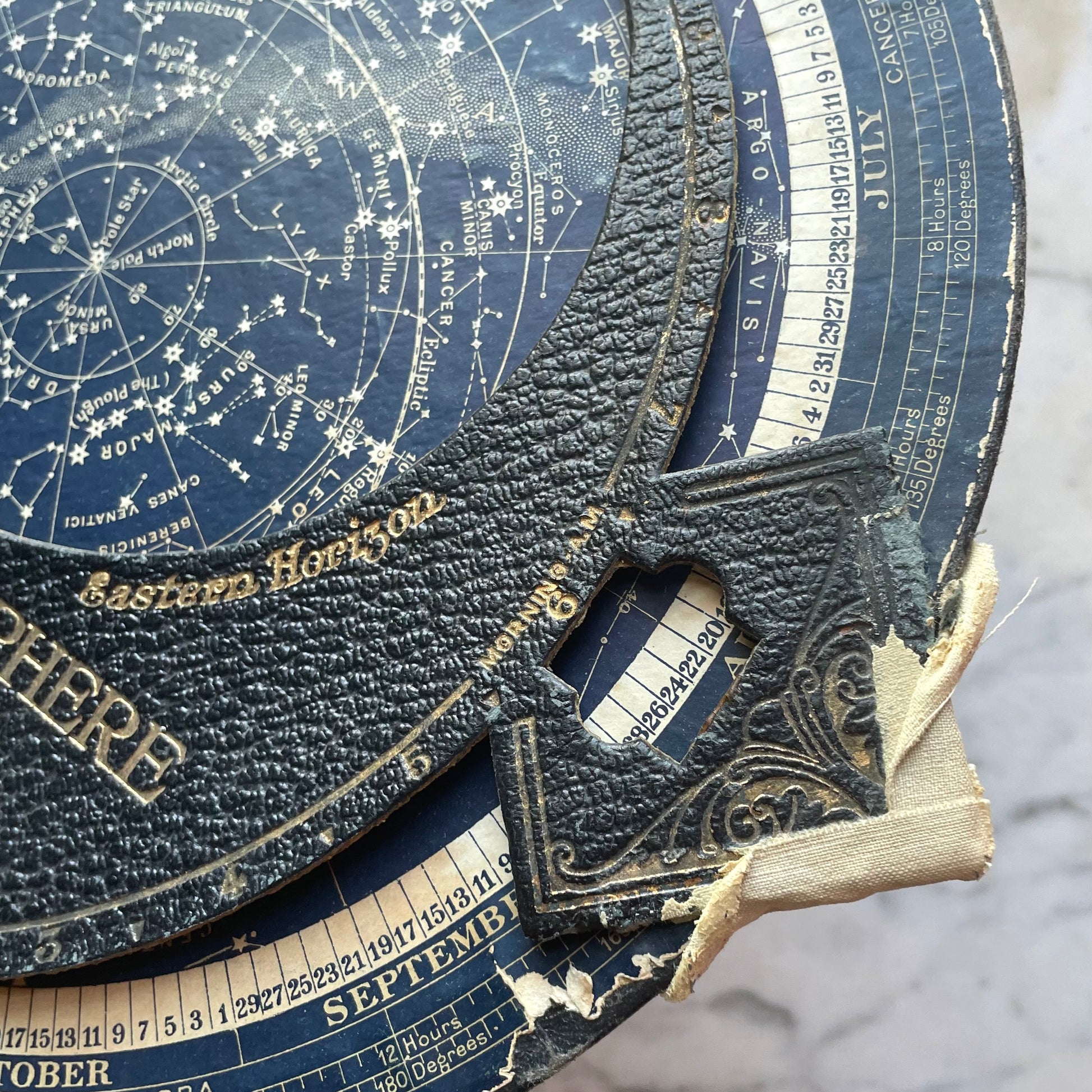 Early 20th century antique planisphere, used for locating stars and constellations. The central wheel contains a celestial map and turns with the North Pole at the center. You could absolutely take it out and use it to stargaze today, although most collectors seek them out for their beautiful appearance. Refer to photos for size and condition: Some wear to the paper of the central wheel around the edges, and one corner has a very old repair with fabric tape which I have not attempted to remove.
