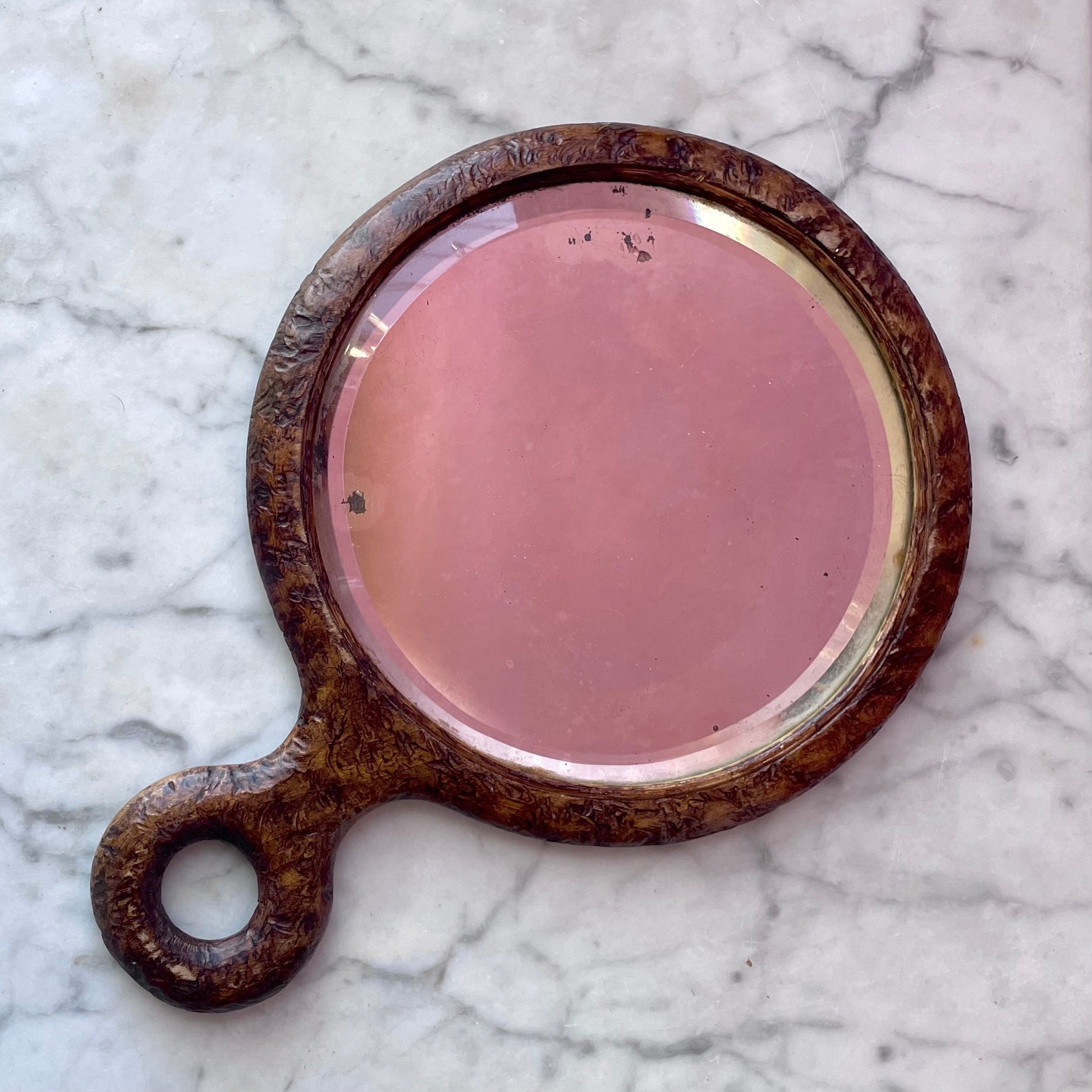 So dreamy! Turn of the century antique round wooden hand mirror with pyrography roses. Refer to photos for size and condition: Overall very good with some minor wear to the glass around the edges from age.