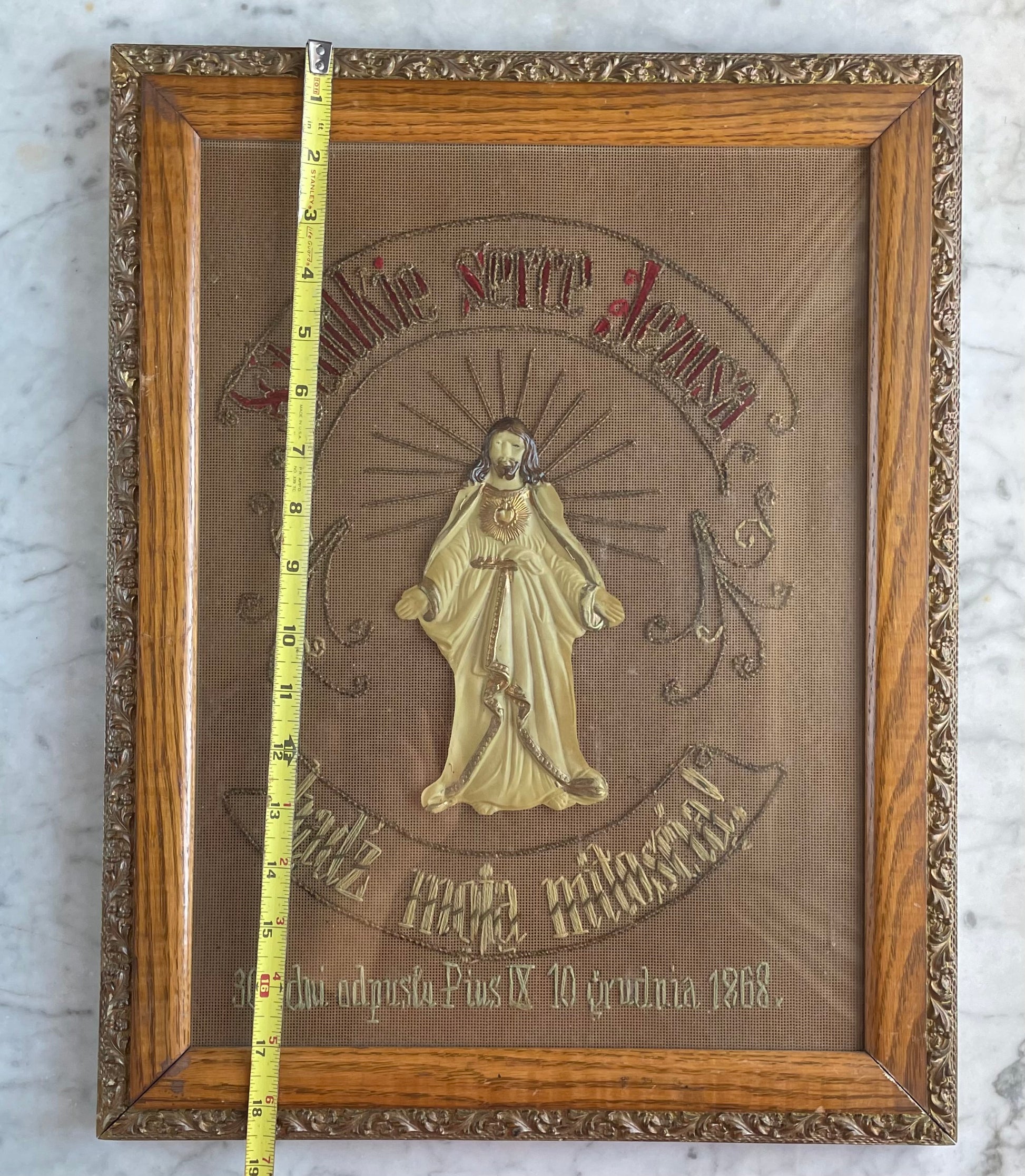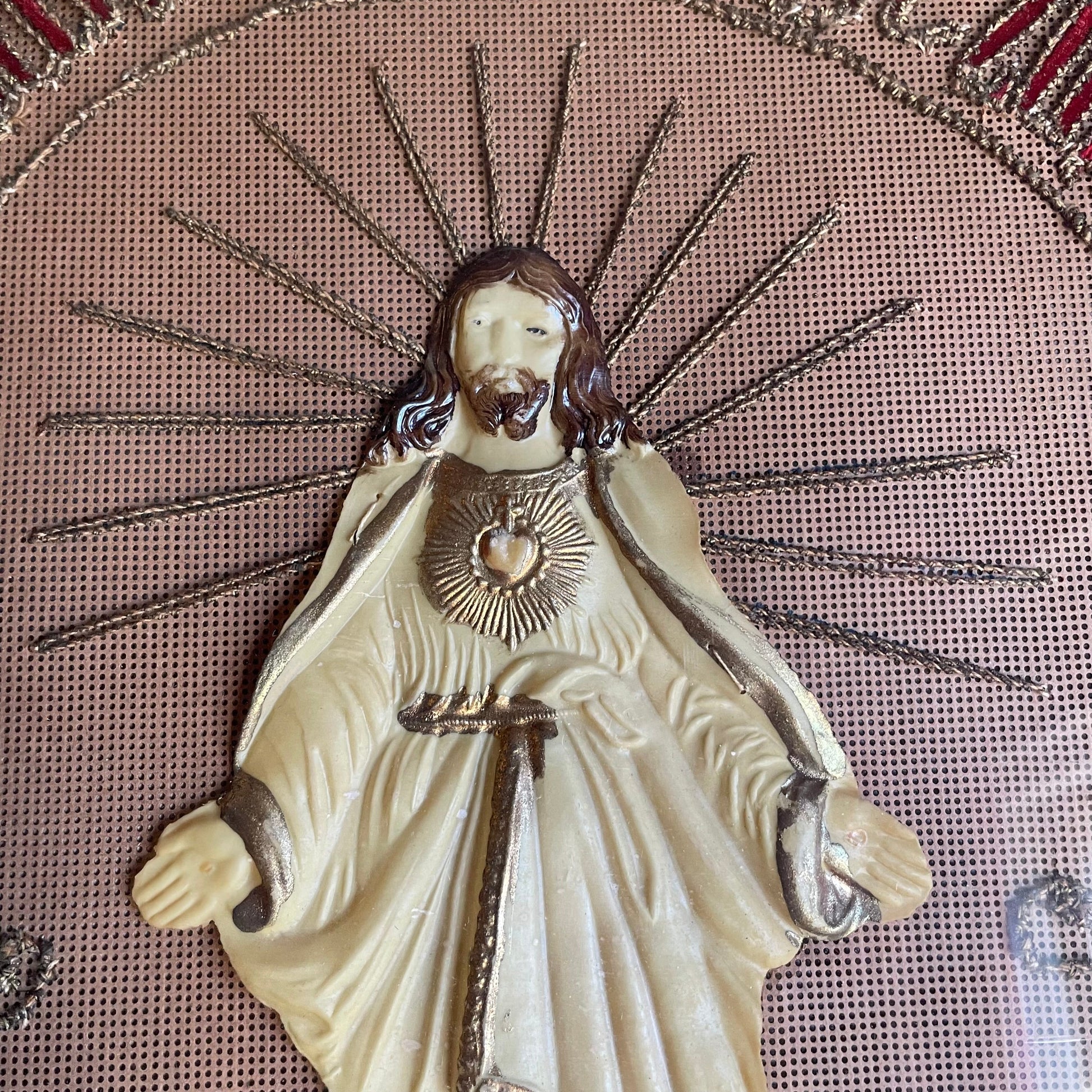 Antique Religious Punch Paper Embroidery with Celluloid Christ