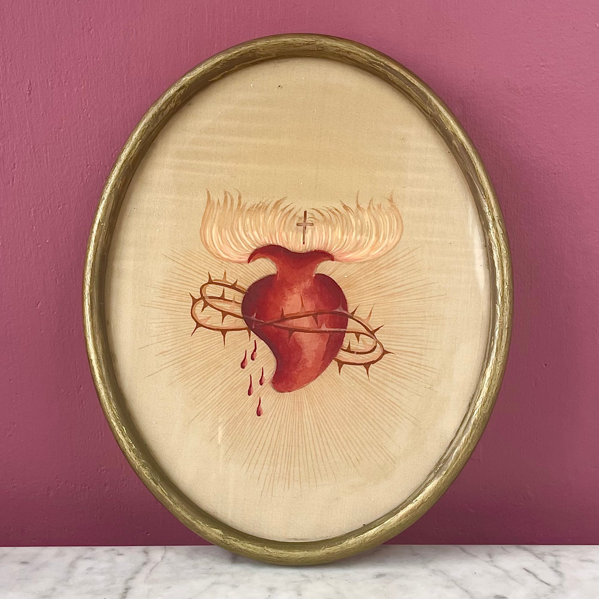 Exquisite antique sacred heart painting on silk in its original gold oval frame. Refer to photos for size and condition: Very good.