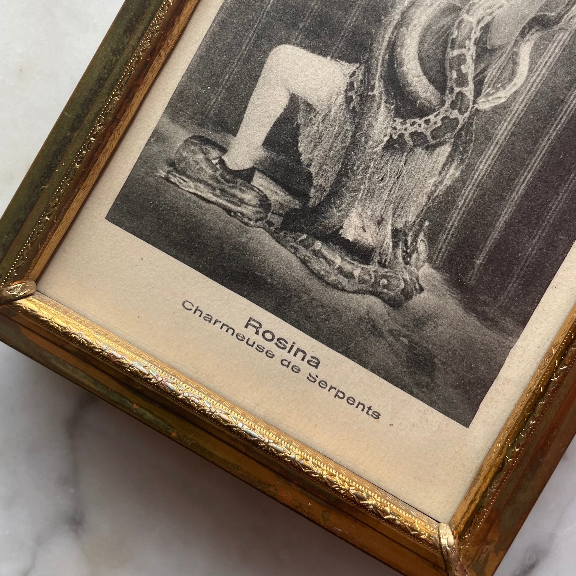 Early 20th century antique French postcard depicting a female snake charmer, Rosina, holding up a massive boa. Presented as found in a gold toned antique frame, fitted to hang and to stand tabletop. Refer to photos for size and condition.