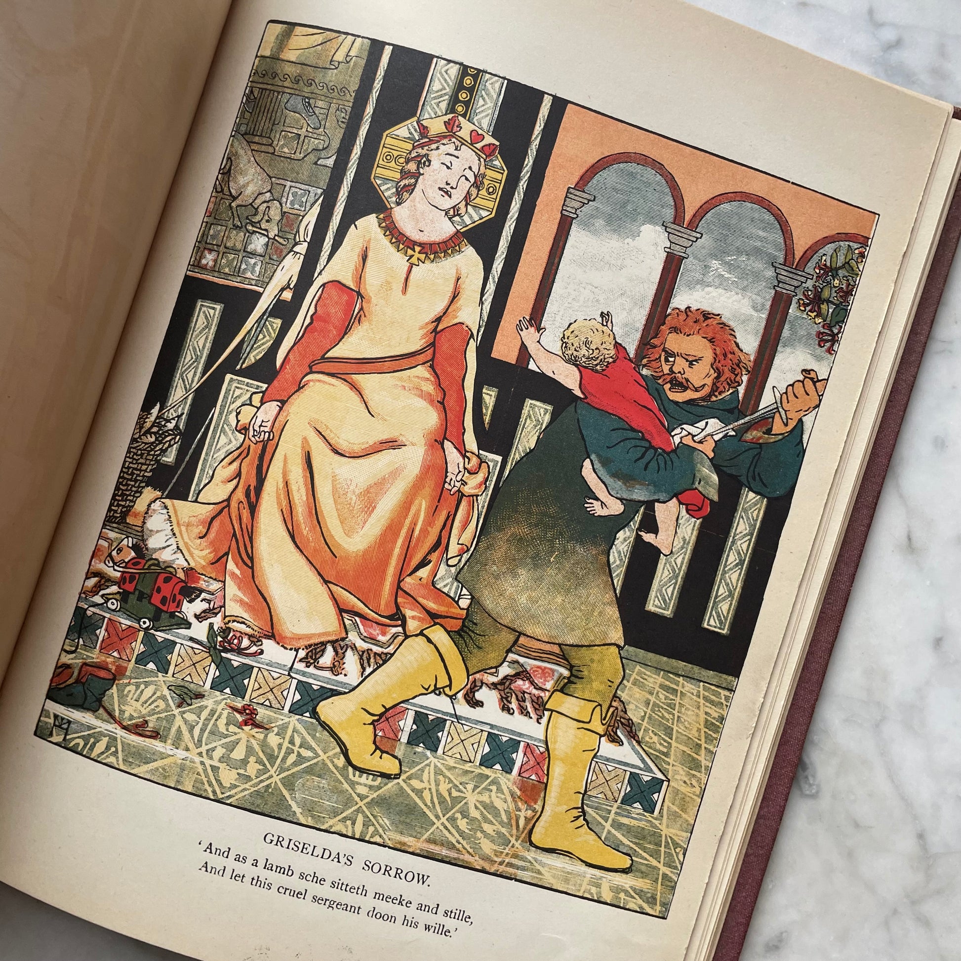 Stunning Victorian picture book in Middle English, a cheerful guide to Chaucer’s Canterbury Tales by Mrs. H. R. Haweis (Mary Eliza Haweis). I love that we have a female medievalist here! The book is filled with gorgeous full color lithograph prints reminiscent of Walter Crane. Condition is good overall with some fading to the cover and wear at the top of the spine.