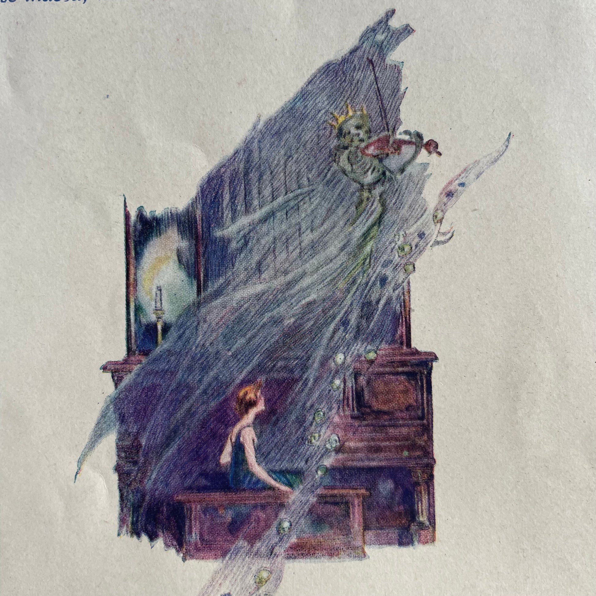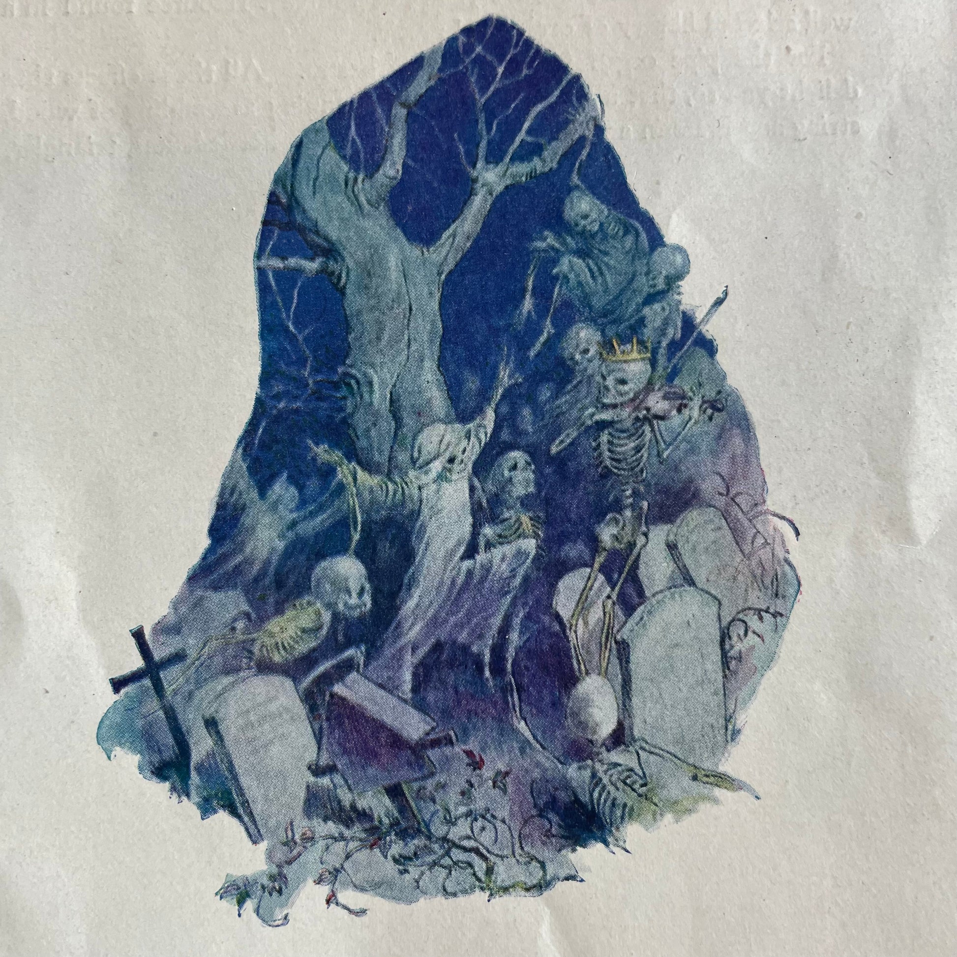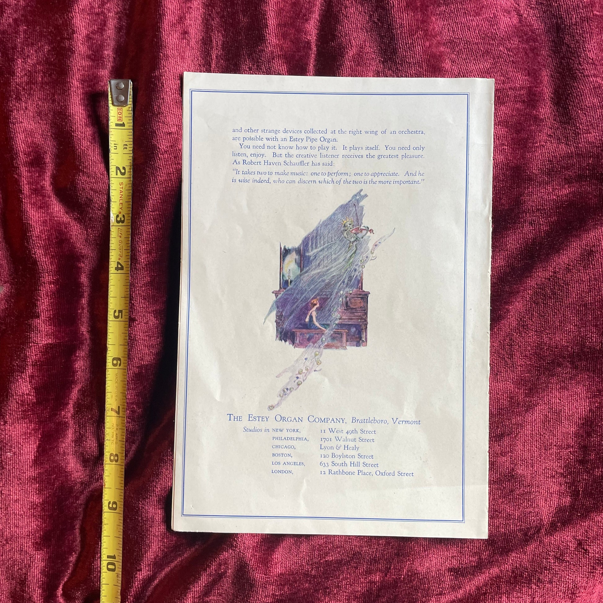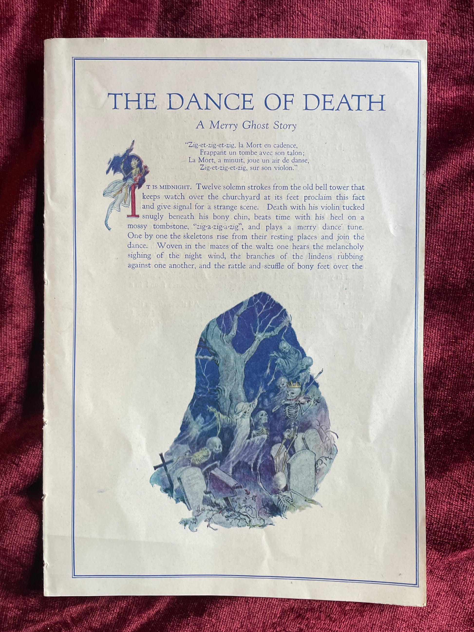 Very rare antique ad for Estey Organ Company of Brattleboro, VT, featuring spooky illustrations from Camille Saint-Saëns’s iconic La Danse Macabre. You’ve probably heard this famous piece of music in numerous places: It’s a symphonic poem that tells the story of Death awakening the deceased from their graves to dance to his fiddle at midnight. The xylophone represents the knocking of the bones. I bet you never knew it has lyrics! They are printed in this ad, which uses this complex, beloved piece as an example of all the things their organ can do. As Halloween antique collectibles go, you won’t find another person with this. Newly released from my personal collection.