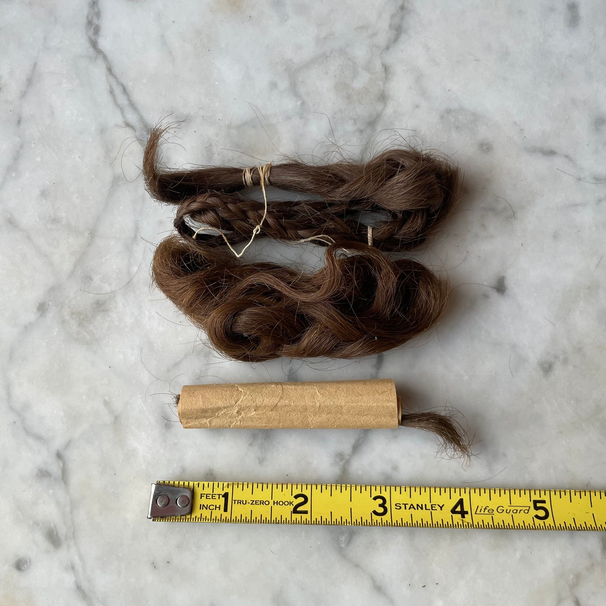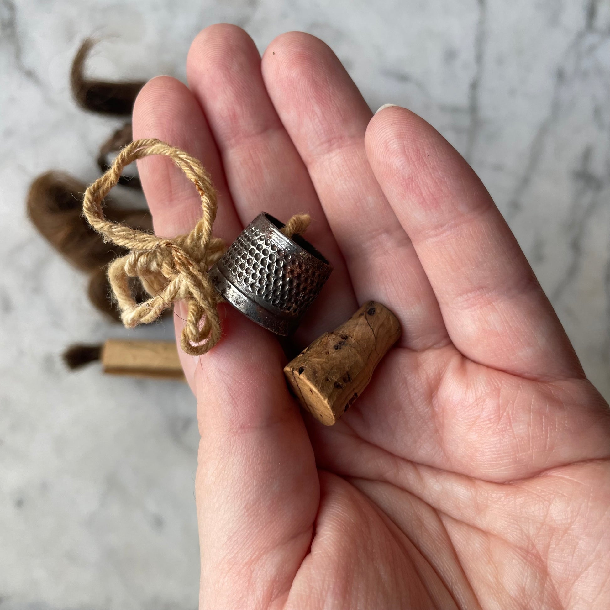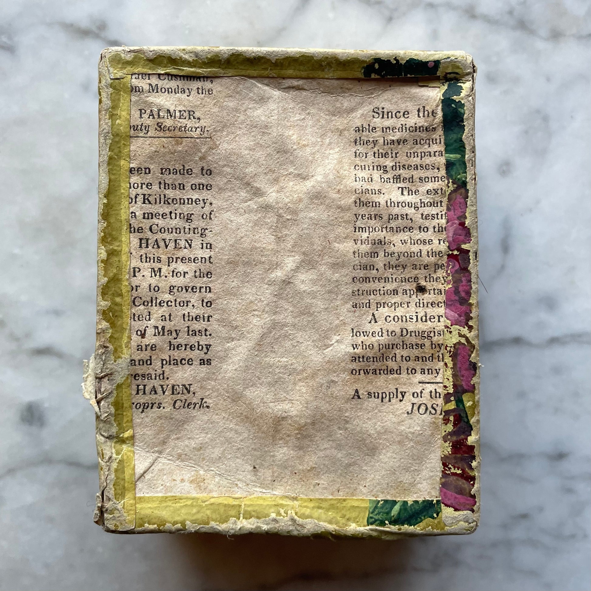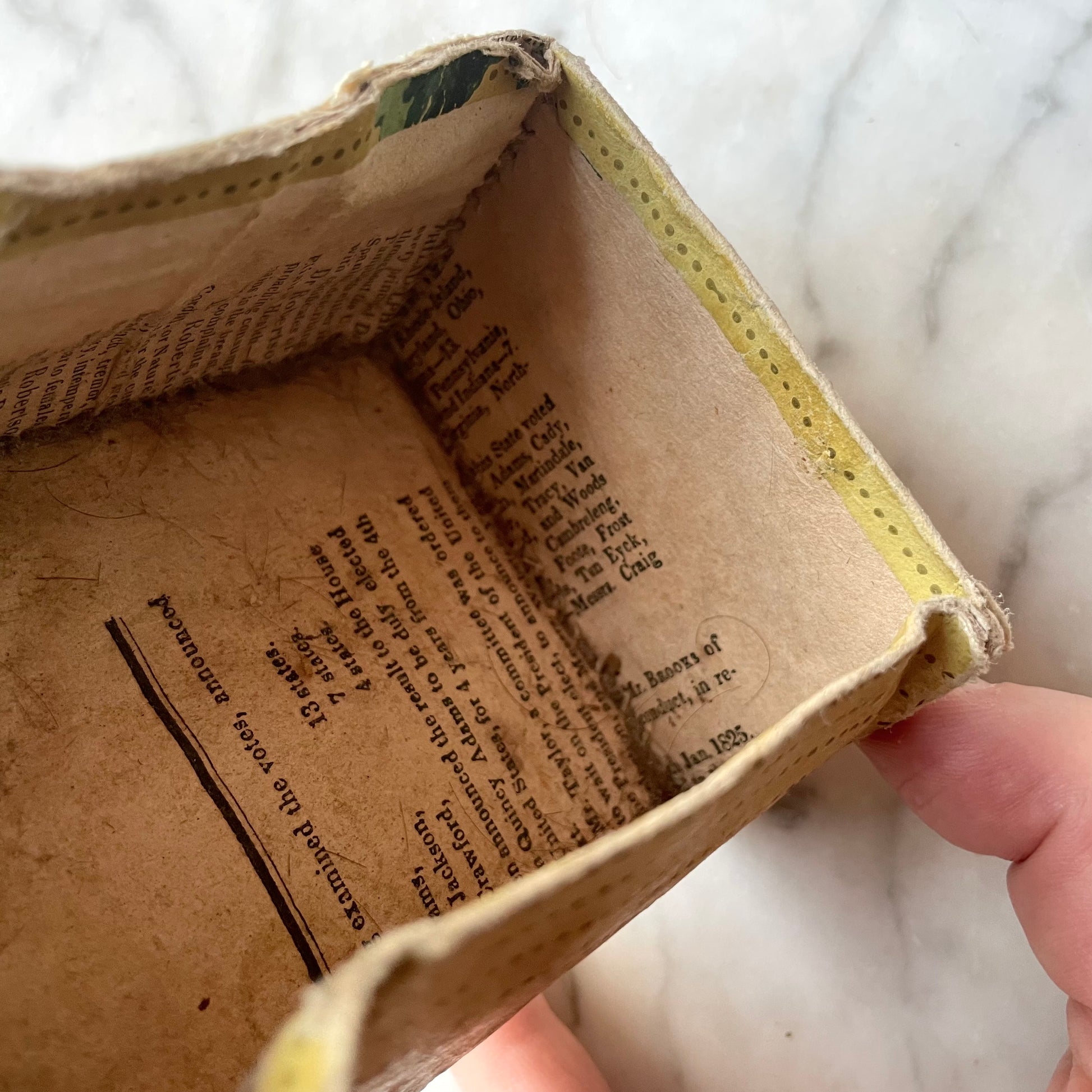 This early 19th century box came from a NH estate and is hand sewn together from newspaper and scraps of wallpaper. The paper inside describes the 1824 presidential election and I spotted the date 1825, so the box and its contents date to around that time. Inside are several locks and braids of hair, two brass rings, a cork, and a thimble with the bottom cut off and tied with string. Refer to photos for size and condition: The box and lid look a little squished on the sides, but they were not made quite perfectly, which is part of the charm with handmade pieces like this. It’s really nice to see an early wallpaper box at this tiny size- I am as excited about that as the hair inside!