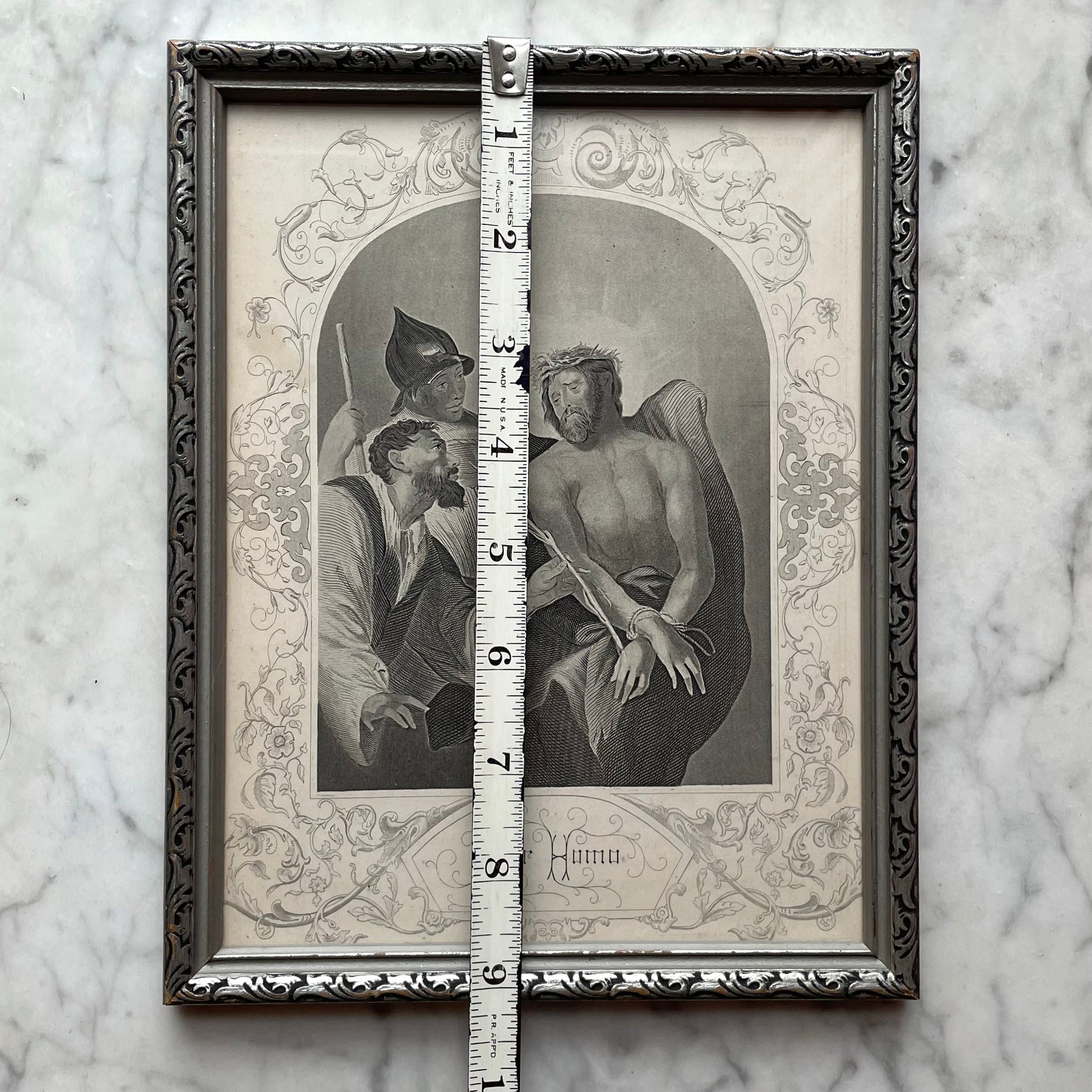 Antique black and white engraving of Christ with his wrists bound with the motto “Ecce Homo.” This is the moment Pontius Pilate presented Christ to the crowd after his scourging- “Behold the Man.” Refer to photos for size and condition.