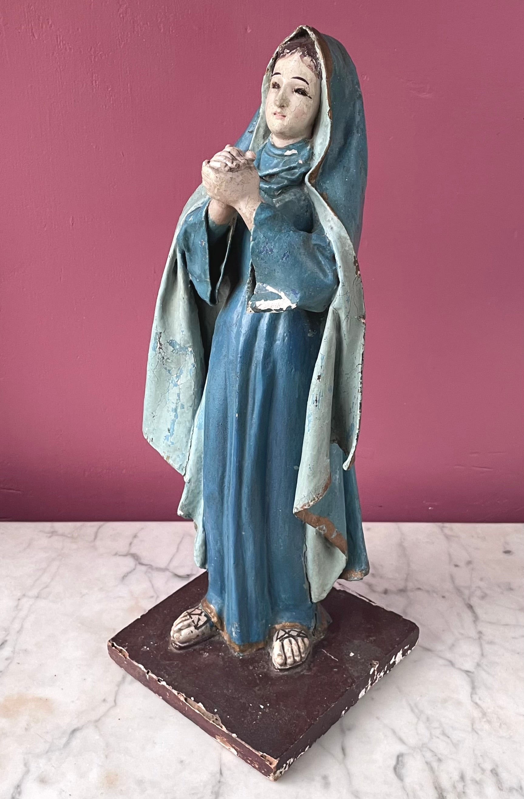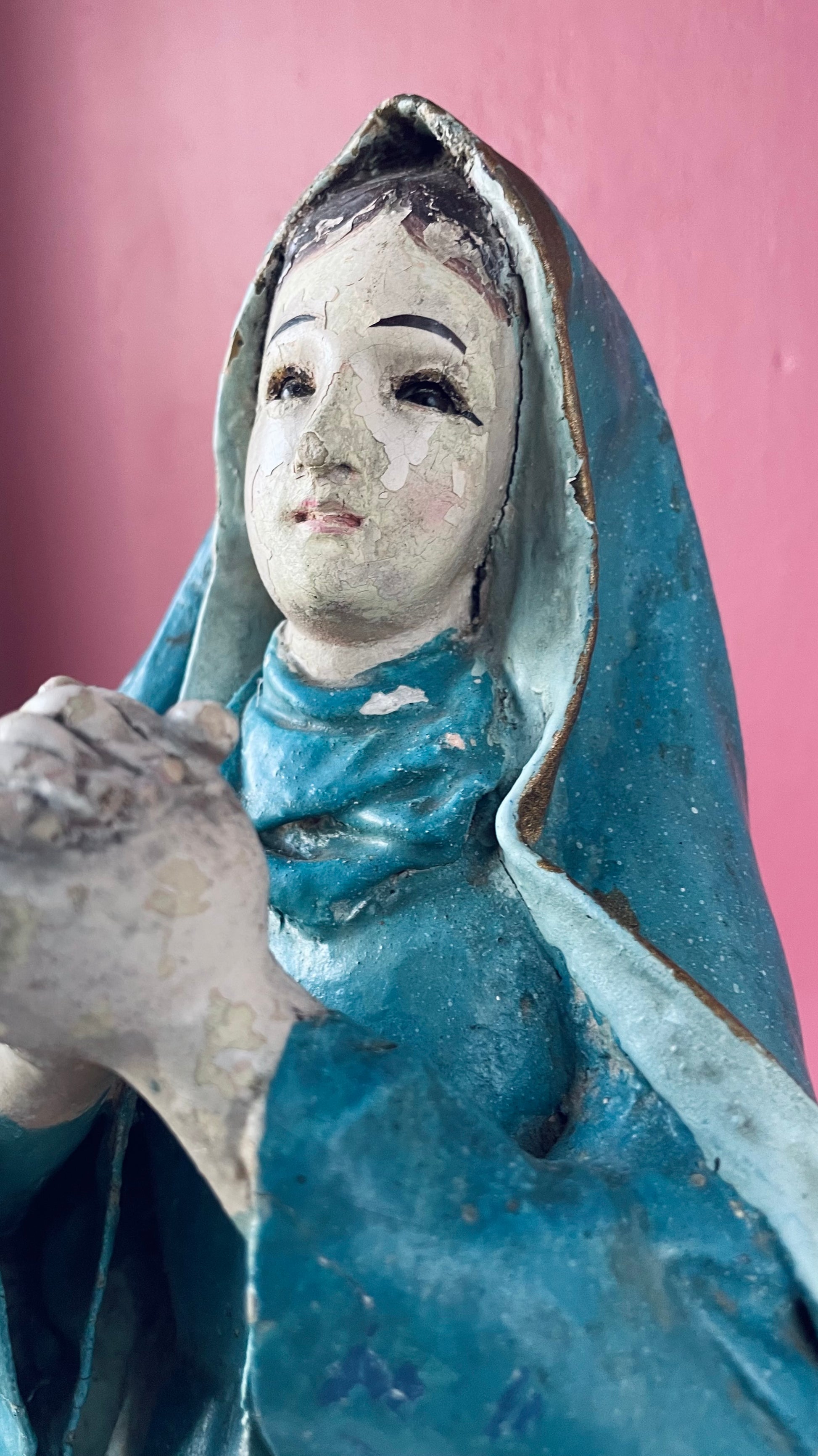 This stunning antique Mother of Sorrows santos figure or parade doll measures about 16” tall and likely comes from Mexico or South America. She’s made of hand painted papier-mâché with evocative glass eyes and a wooden base. The cracking and flaking to the paint all around but especially on her face lends her a hauntingly beautiful quality and seems to amplify her sympathetic qualities- the sadness that this particular depiction of Mary represents.
