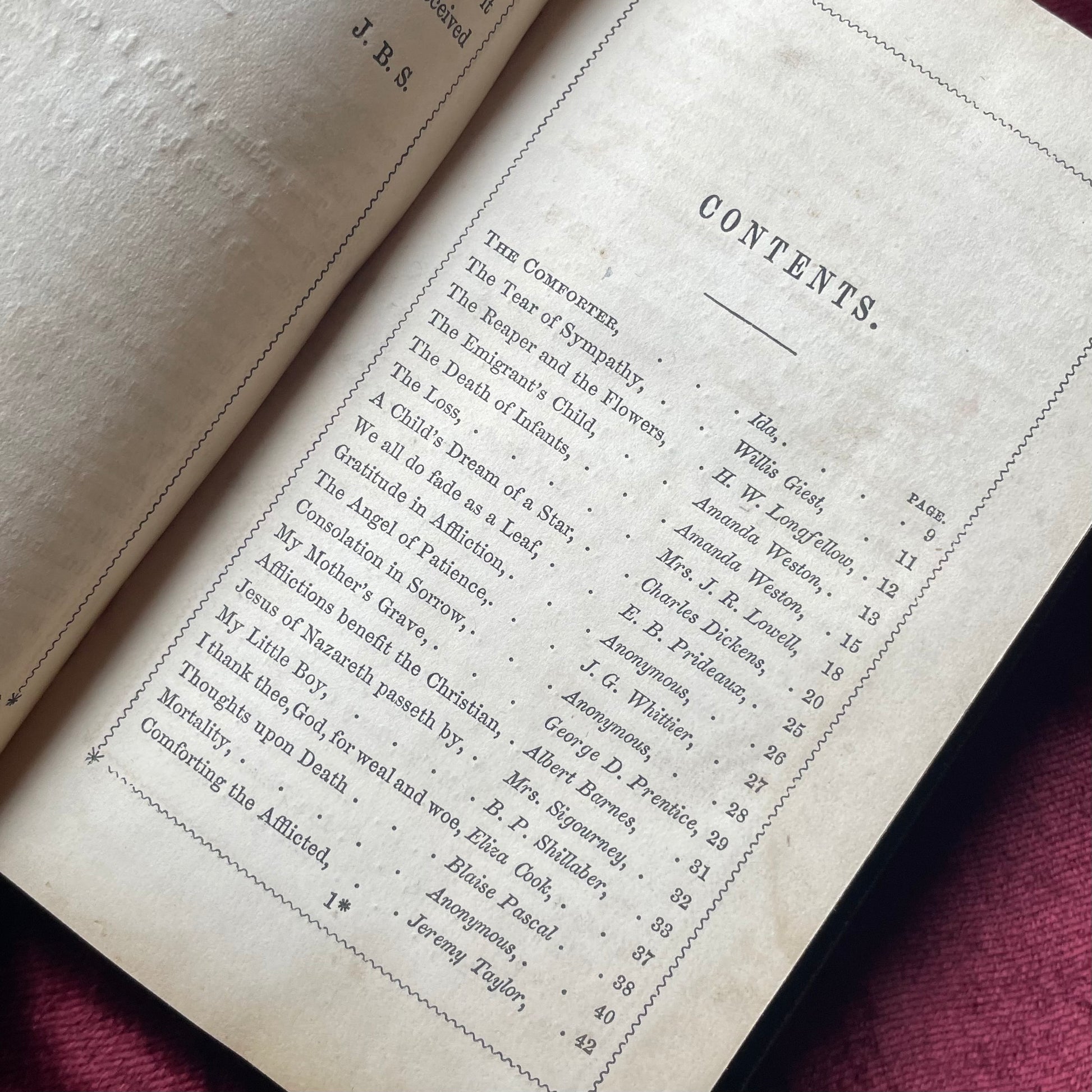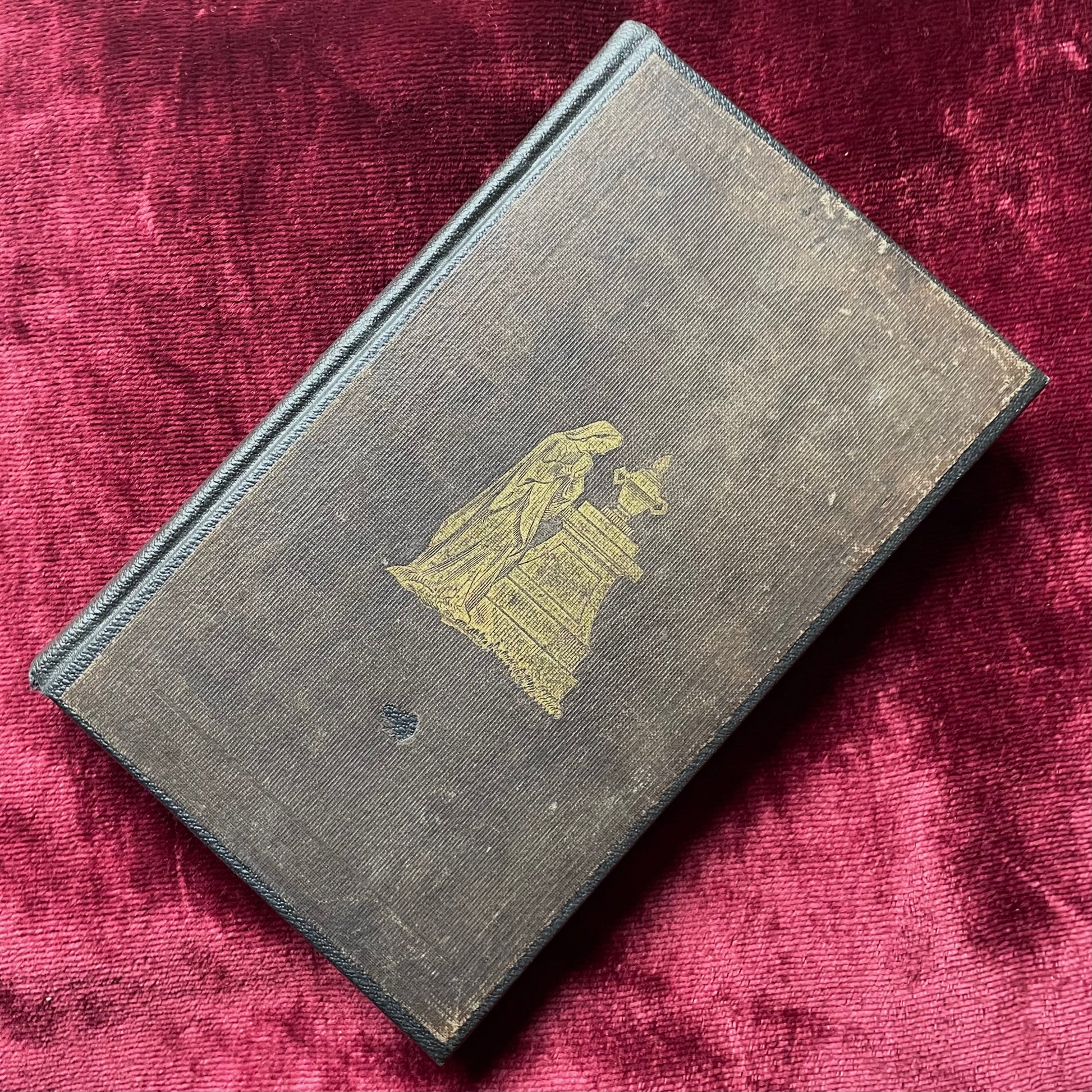 This oft-reprinted Victorian consolation title is now very scarce- likely because the cover design is so beautiful! It has a gilt decoration of a mourner weeping beside a cemetery monument blindstamped on the cover. The book contains various poems and religious essays meant to comfort the bereaved. The binding is plain black cloth. Condition is good overall with a knick to the cloth cover below the blindstamping, some foxing, and the remnants of an owner’s plate inside the front cover. Sold as is.