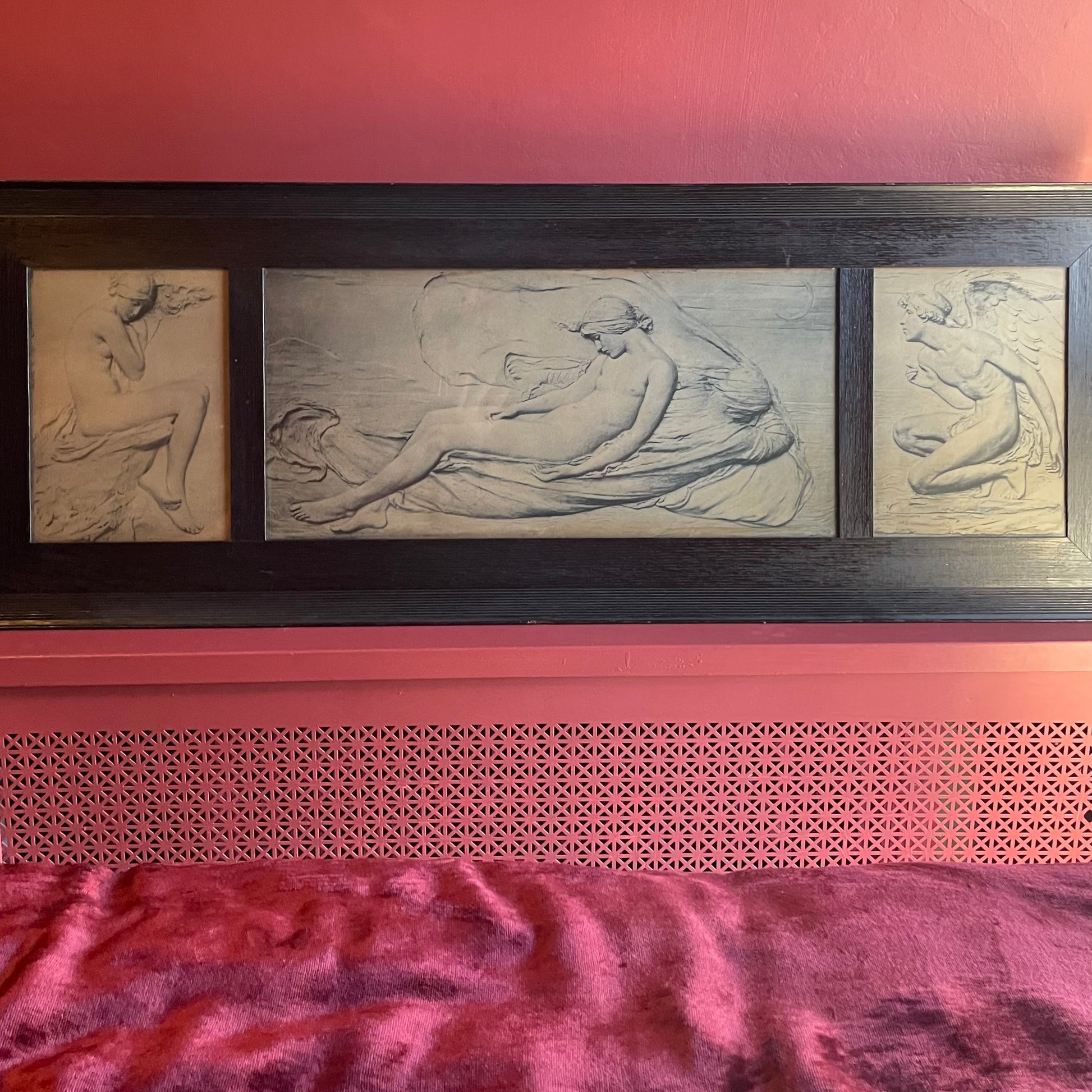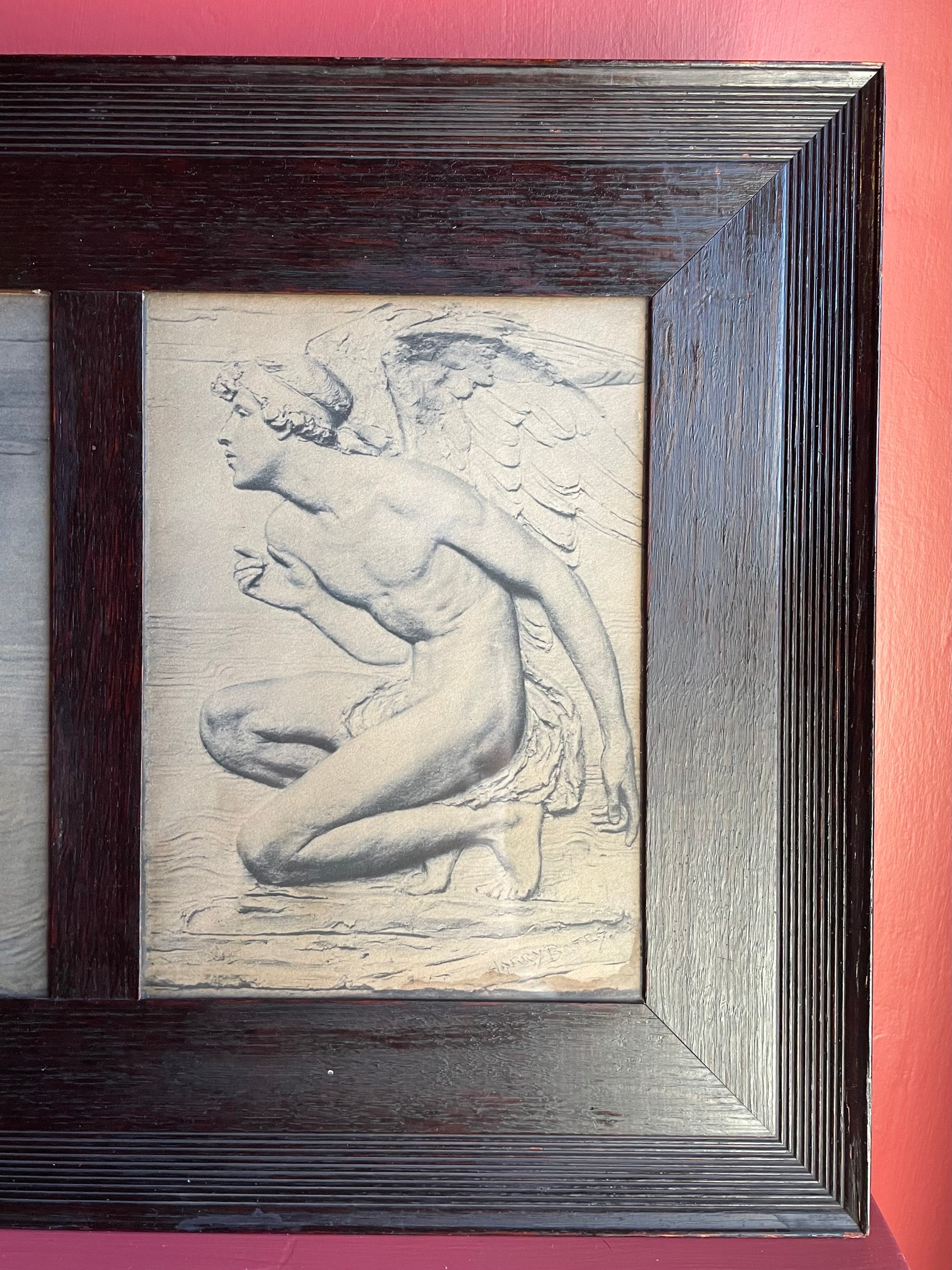 Antique, large format triptych of Harry Bates’s sculpture “The Story of Psyche.” The sculpture was completed in 1883 and photographed here by Frederick Hollyer around the 1890s. The piece is presented as found in its original frame, measuring a whopping 42” x 15.5”. Condition is excellent.