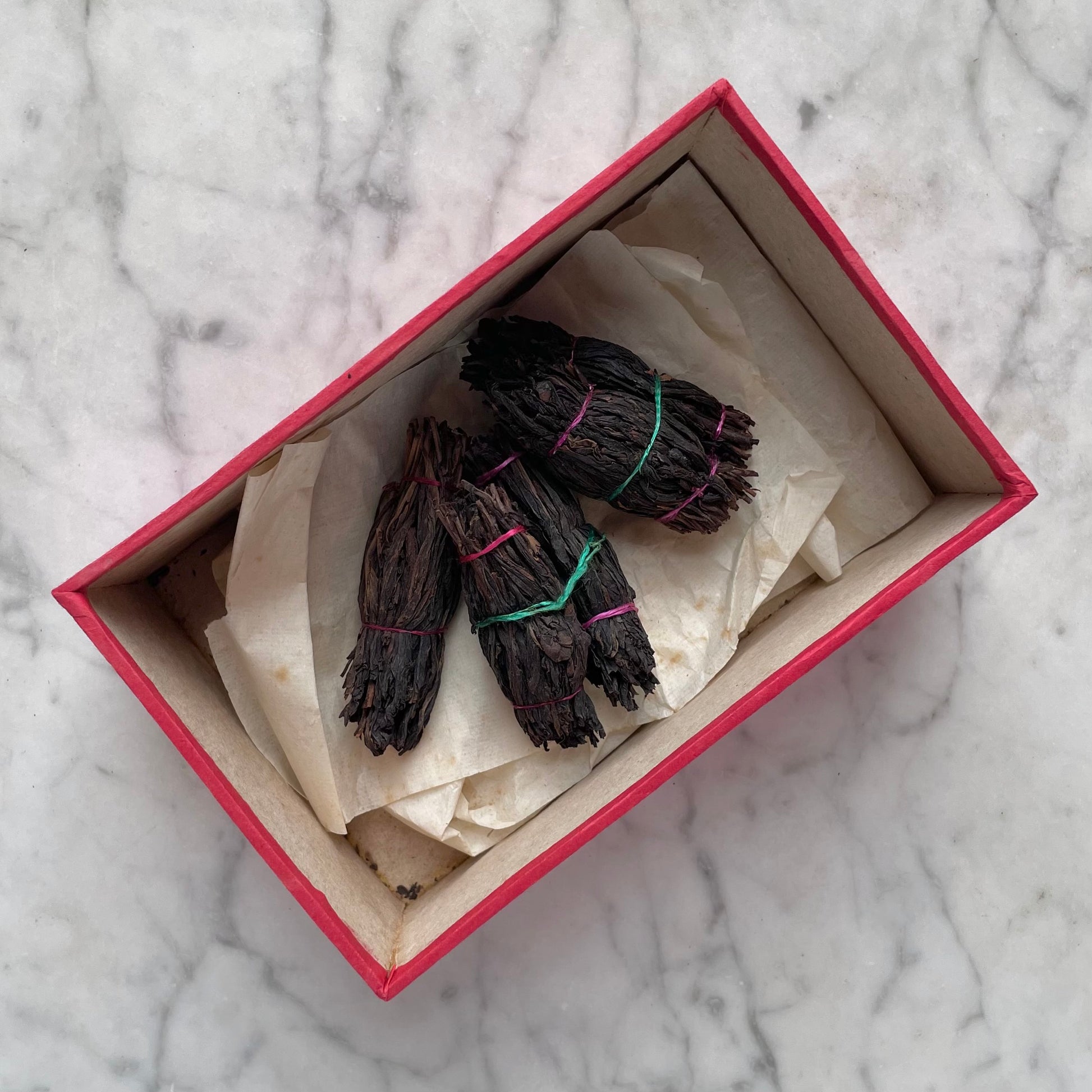 Rare and unusual early 20th century Chinese tea box made of paper and glass. It’s a miracle to me that such a fragile thing survived in such good condition! Best of all, it still retains some of its original contents: Looks like hand assembled bundles of Longxu oolong tea. Hard to tell- it’s long since lost any scent. The inside of the box is trimmed with vivid red, fringed paper while the bottom is wrapped with colorful fabric. Google was able to make out Hong Kong from the label on the side. The box is in outstanding condition with minimal wear. Dates to around the 1920s-1930s.