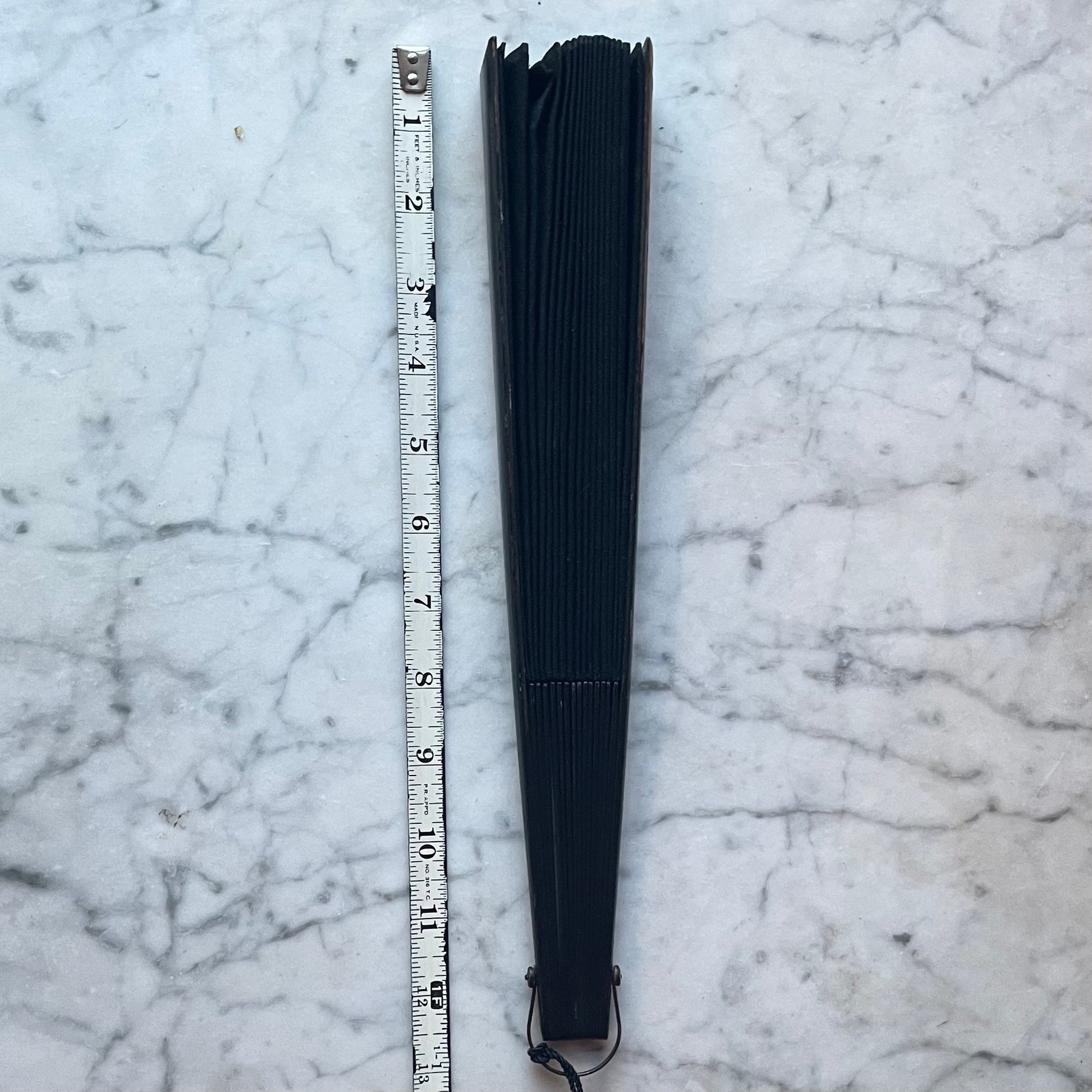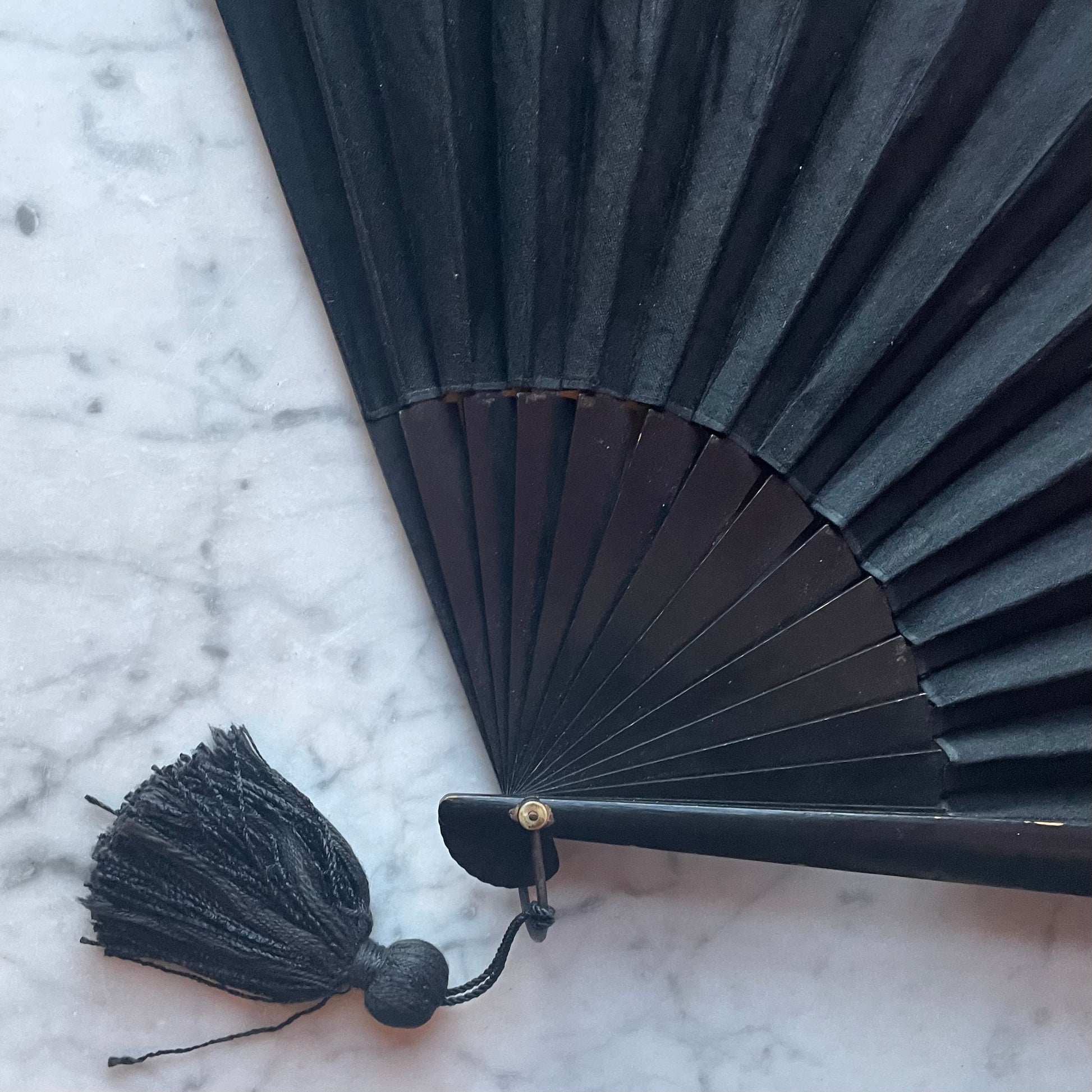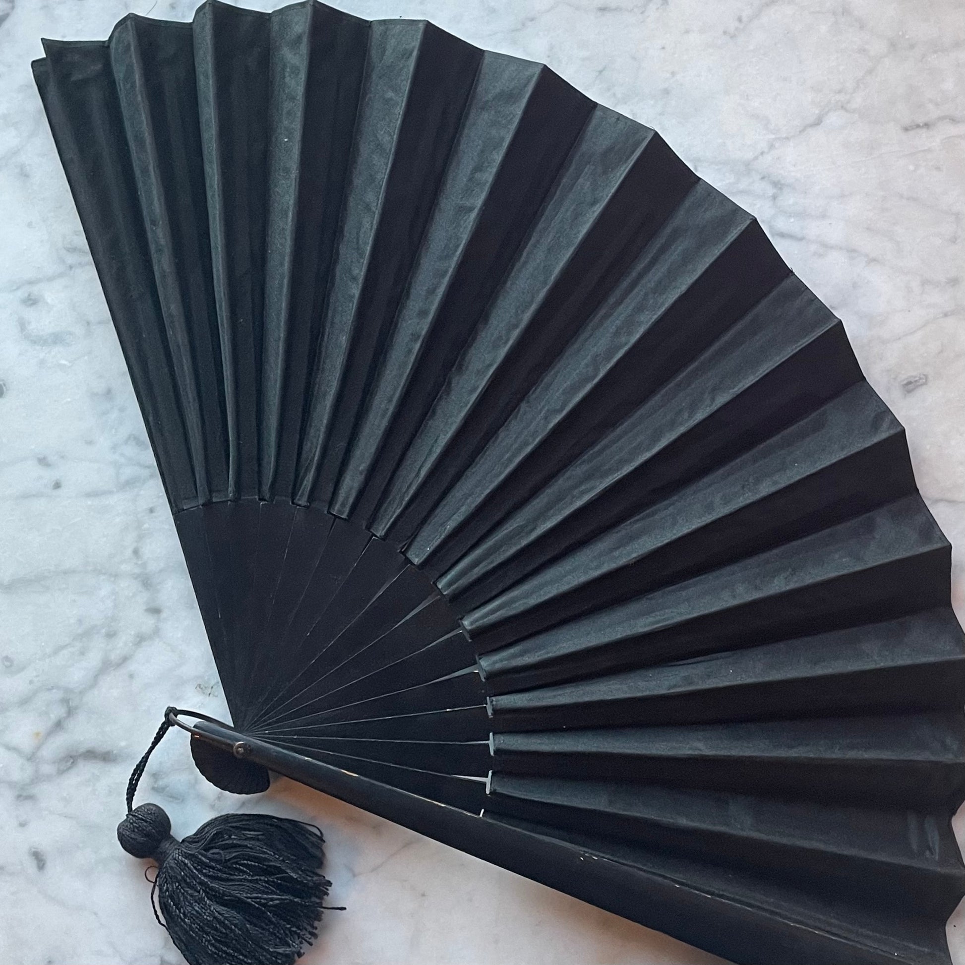 Large Victorian black silk bombazine mourning fan with wooden ribs & endguards and a black tassel at the bottom. Refer to photos for size and condition: Good overall with some minor wear at the top of the leaves and some chipping to the black paint on one side of the endgaurd, as shown. Quite large: Measures about 20” when fully open. Suitable for gentle use or display.