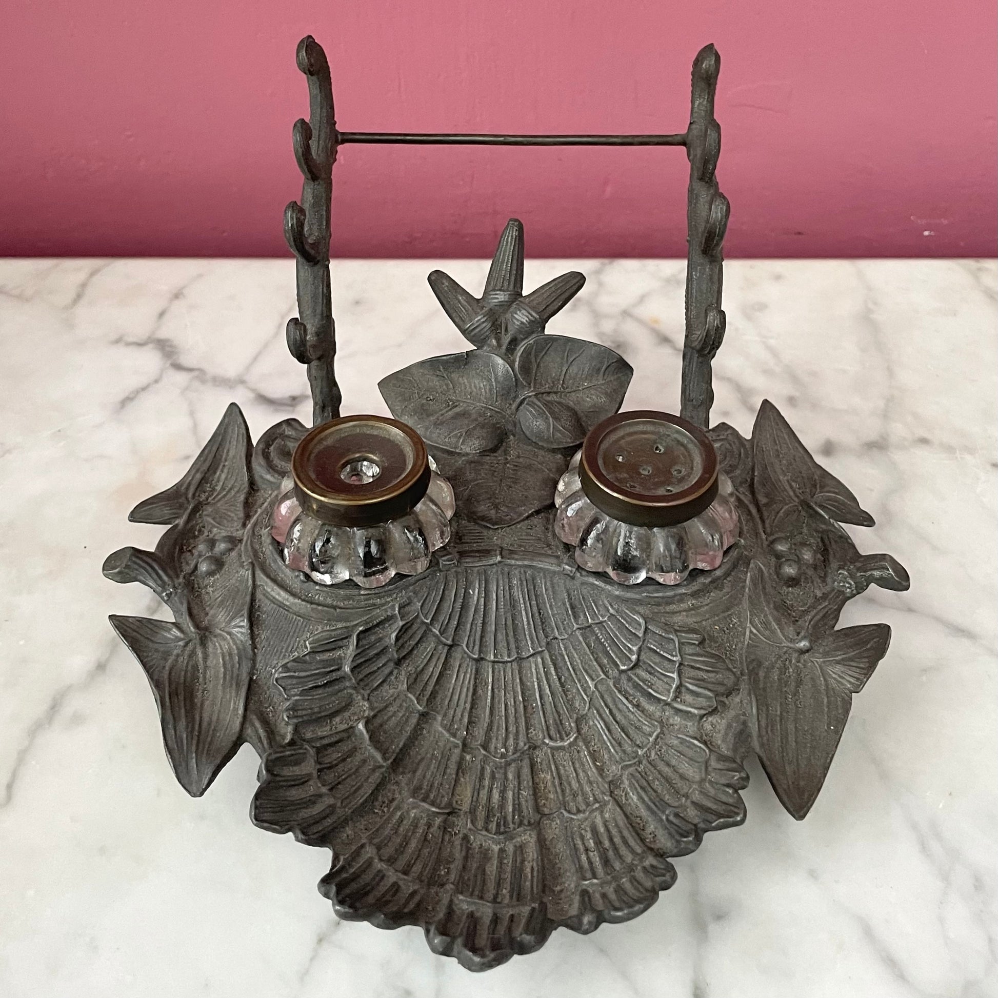 Very unusual and beautiful Victorian desk set made of cast metal with botanical and seashell motifs. This is why I am always so drawn to Victoriana: They loved nature in design as much as I do. The top portion is for resting pens and below there is the original pots for ink and sand. Excellent condition.