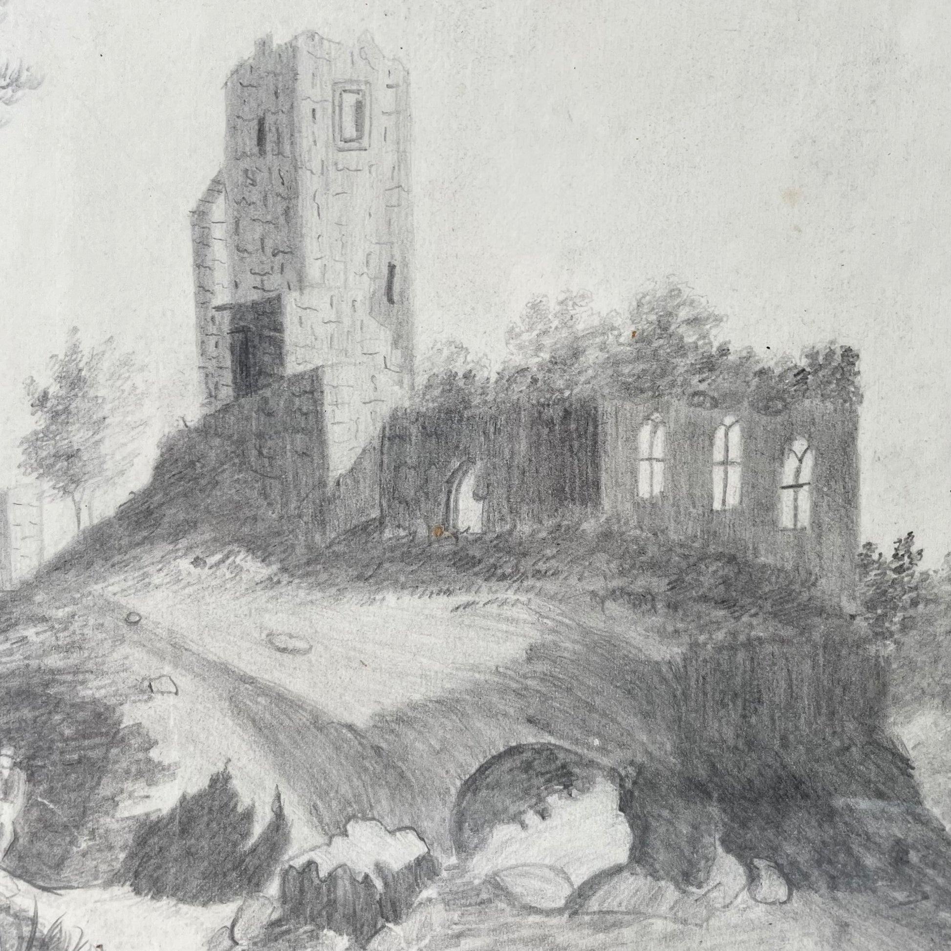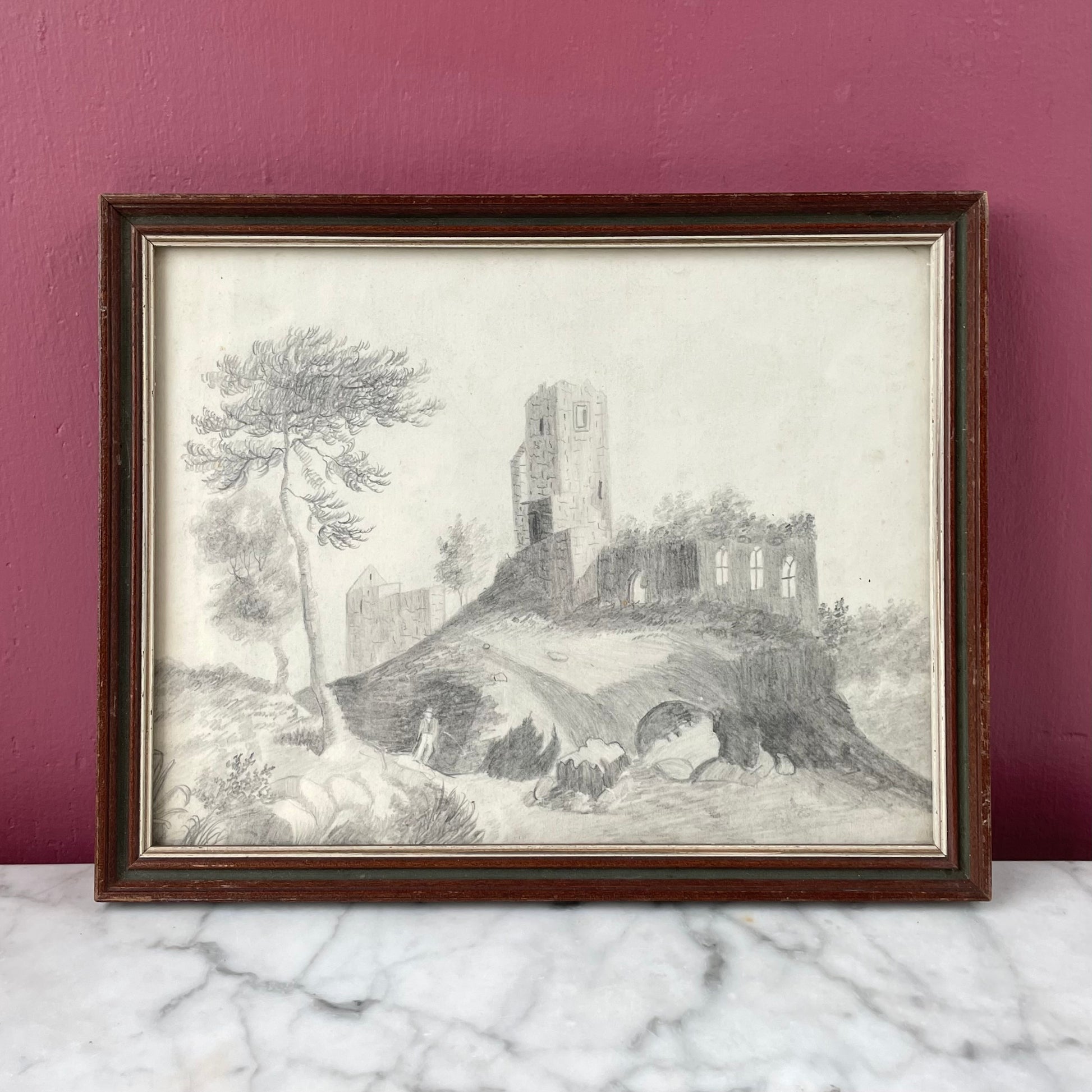 Mid-Victorian pencil sketch of the ruins of a castle presented in a period wood frame. Refer to photos for size and condition: Very good! Charming antique vernacular drawing.