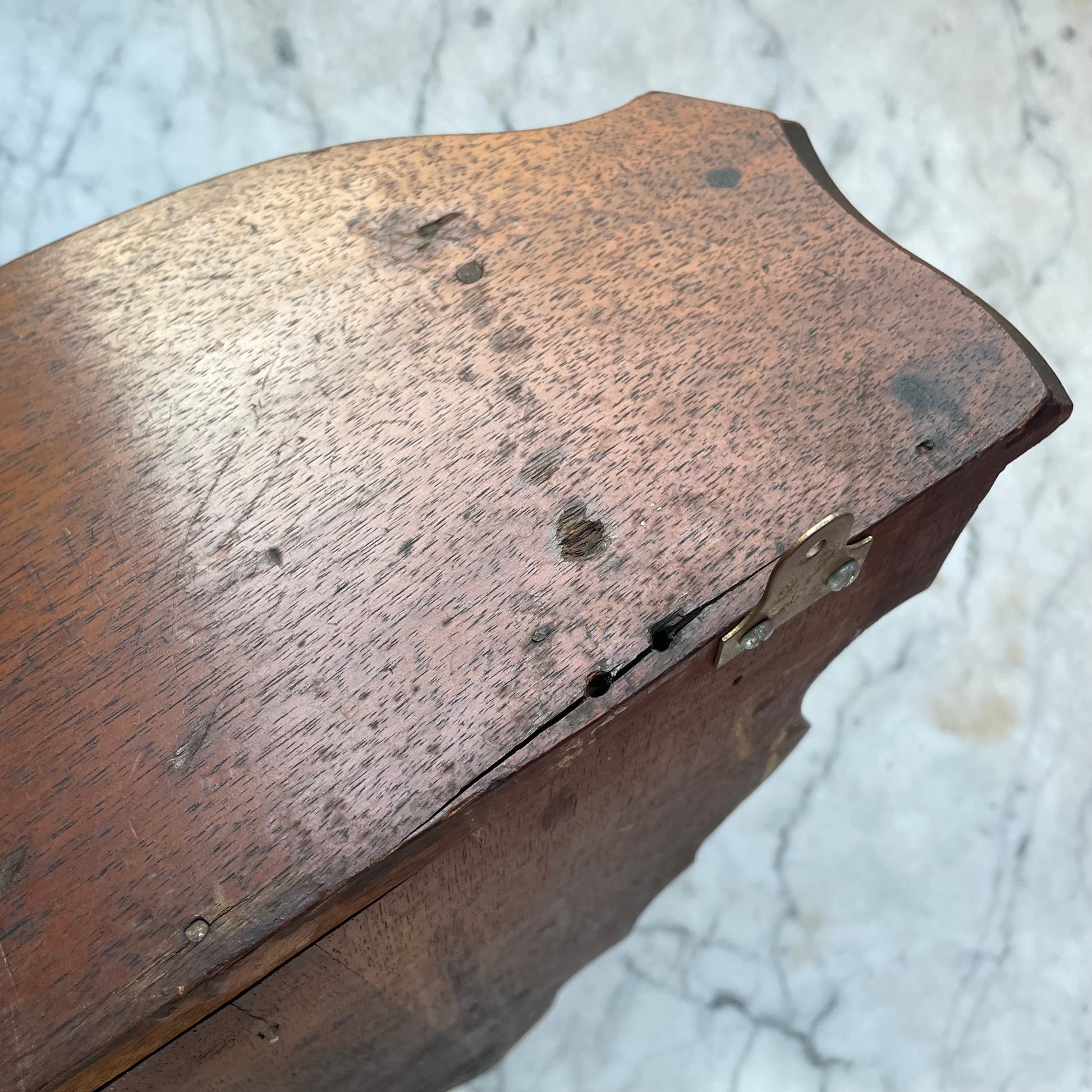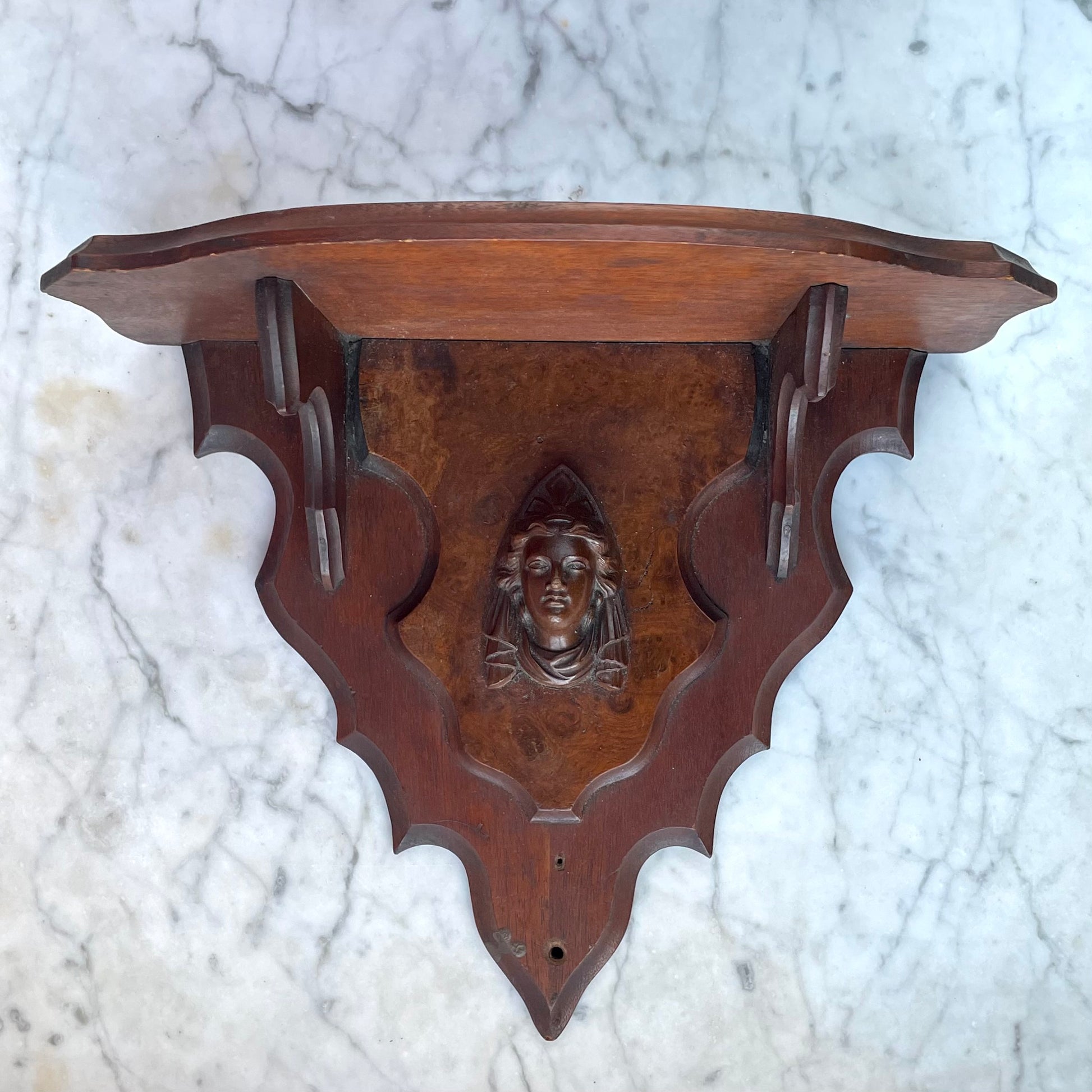 Small but impactful Victorian gothic revival shelf made of carved wood with a veiled lady embellishment at the center. The shelf looks beautiful displayed on its own but would also be suitable to hold something lightweight and small, like a candle or a small statuette. It measures about 13” long and the shelf portion is about 6” at its widest. Overall measures about 9” long. Fitted to hang in the back, but there are also two holes at the bottom where you can reinforce it with a long nail. Condition is good overall with some paint at the bottom and a shallow crack near the back.
