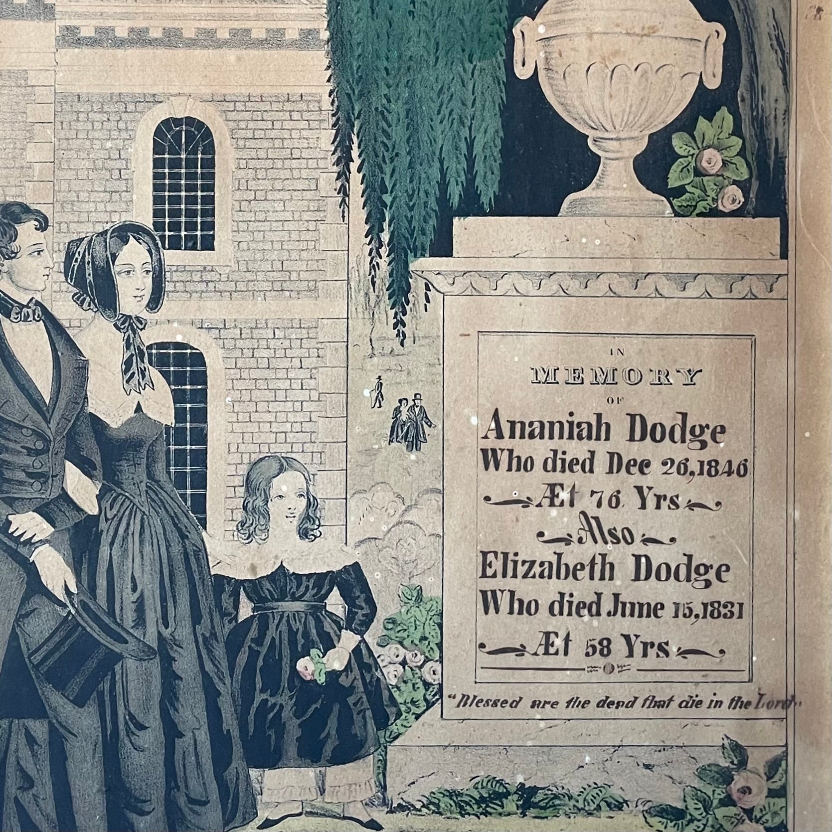 Early Victorian mourning print by Currier & Ives, who manufactured several different designs in the mid-19th century. They always feature the weeping willow motif and a blank tombstone or monument, on which you would write the name of the deceased & their date of death. This one is inscribed for two family members, one who passed in 1831 and one who passed in 1846. Refer to photos for size and condition: Very good.
