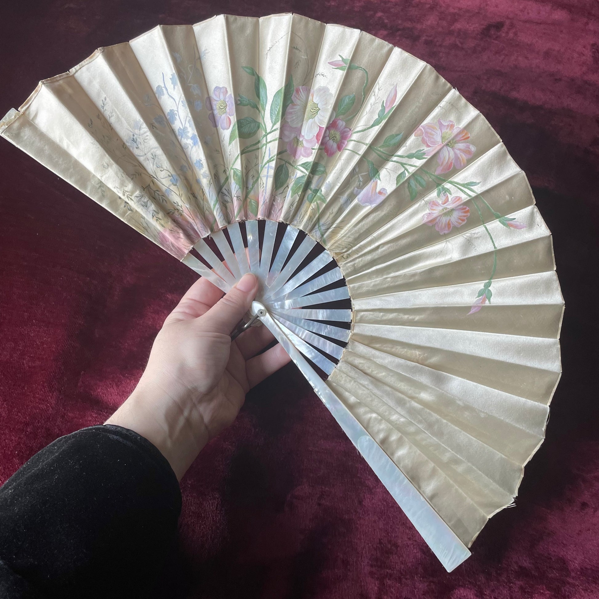 Victorian Painted Silk Fan with Mother of Pearl