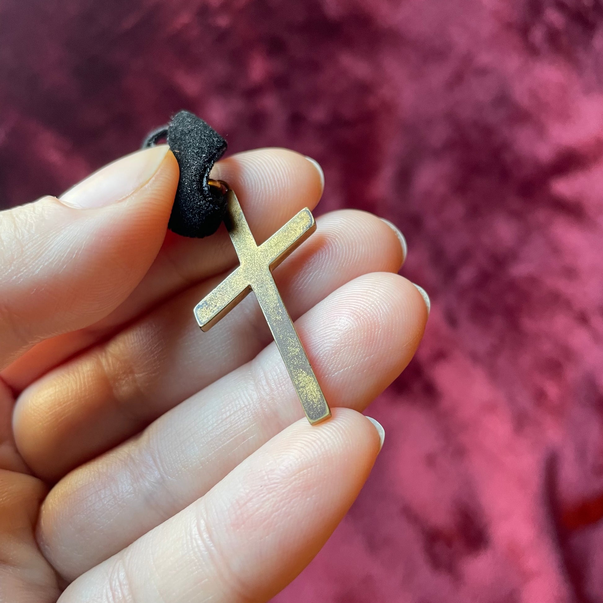 This one features a gold-toned Victorian cross with faux seed pearls. Refer to photos for size and condition: Very good. The velvet portion of the choker measures about 10” with a 3” extender.