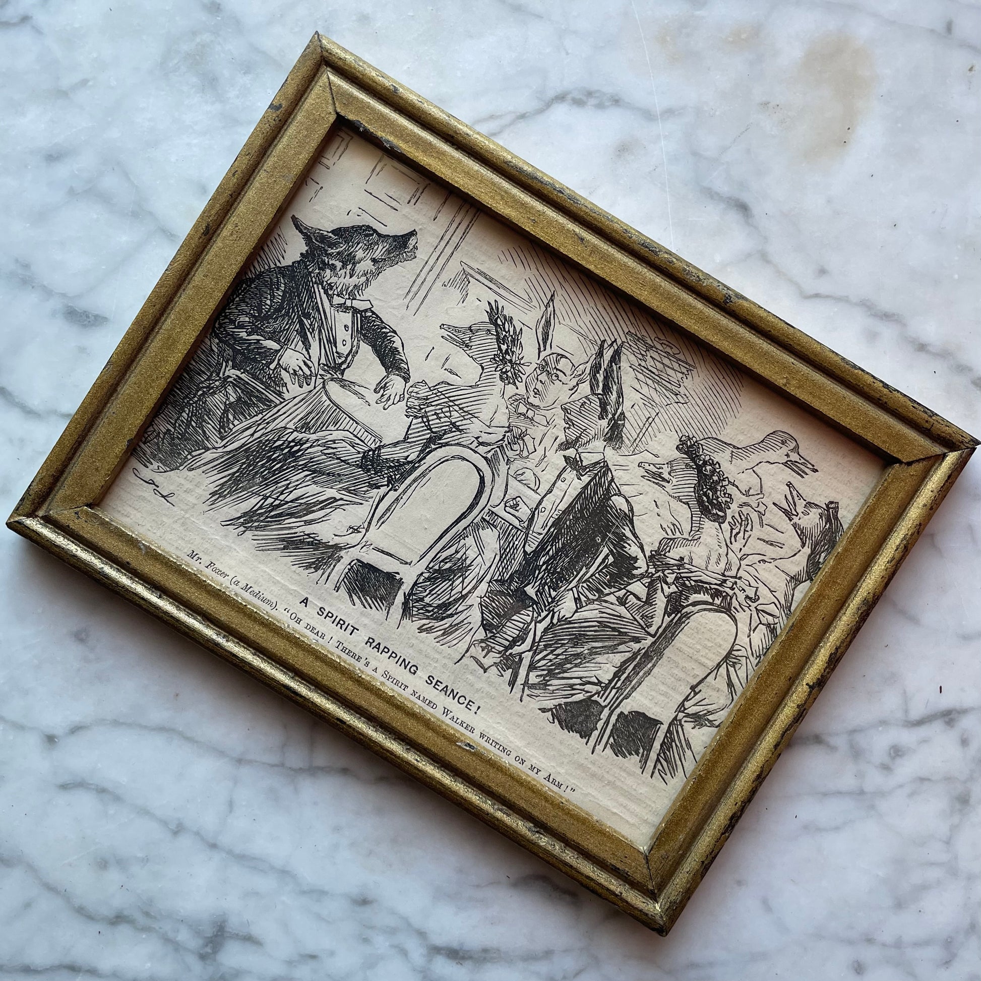 Victorian black and white cartoon satirizing the spiritualist movement and its hucksters. A menagerie of anthropomorphic animals sit around the seance table: The fox is possibly a reference to the infamous Fox Sisters. Refer to photos for size and condition.