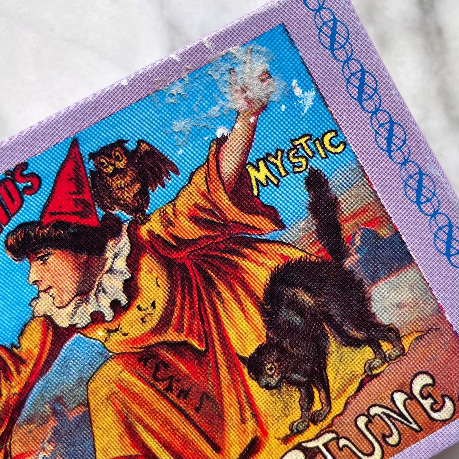 Mircentury vintage reproduction of the 19th century Lenormand fortune telling card set in a sensational box with witchy graphics. Refer to photos for size and condition: Very good; deck is complete with instructions and looks unused. Some residue from an original price sticker on the box.
